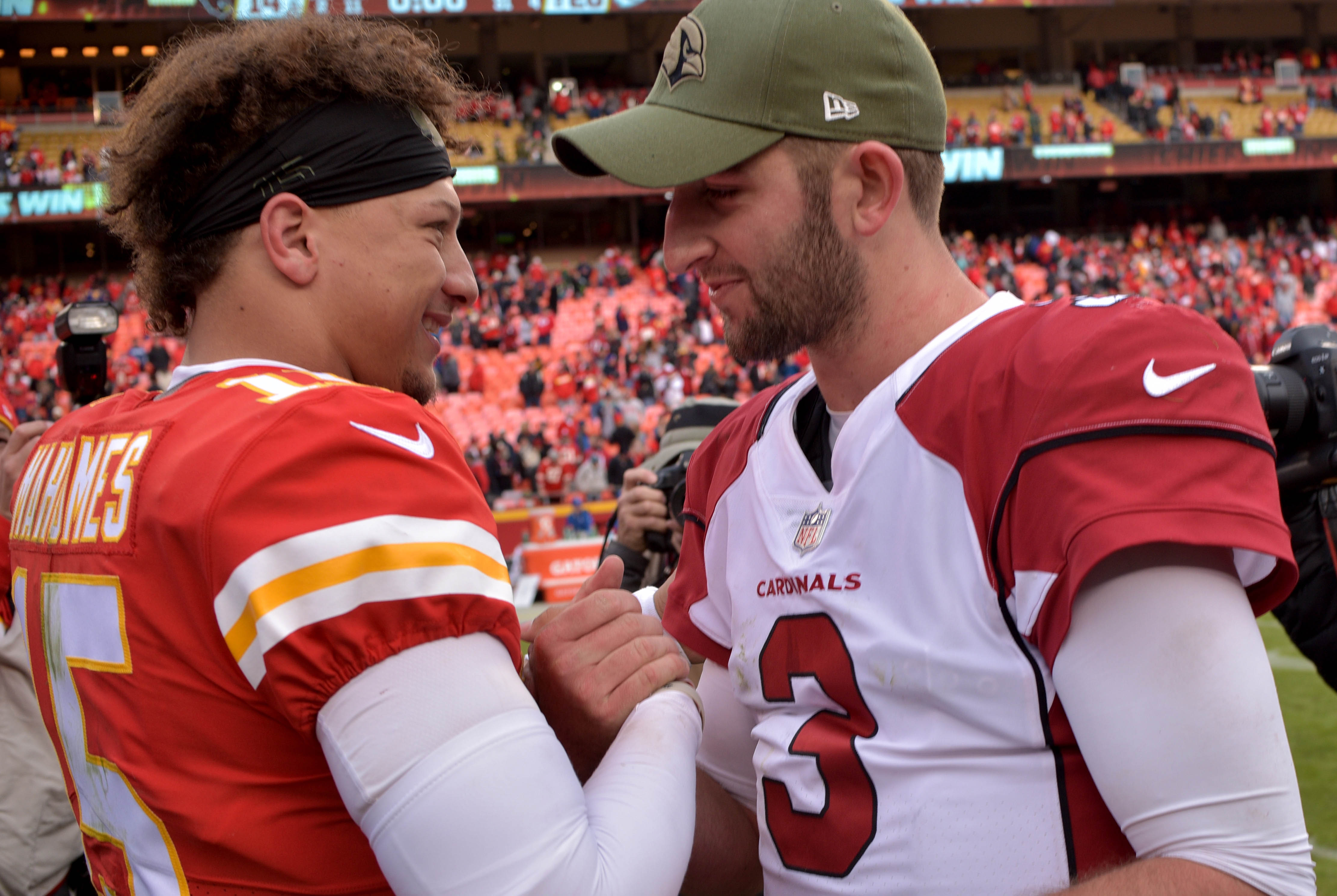 Nov 11, 2018; Kansas City, MO, USA; Kansas City Chiefs quarterback Patrick Mahomes (15) shakes hands with Arizona Cardinals quarterback Josh Rosen (3) after the game at Arrowhead Stadium. The Chiefs won 26-14. Mandatory Credit: Denny Medley-USA TODAY Sports / Denny Medley