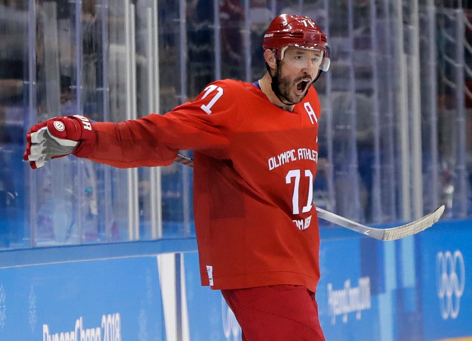 Russian athlete Ilya Kovalchuk (71) celebrates with Sergei Andronov (11) after scoring a goal during the second period of the preliminary round of the men's hockey game at the 2018 Winter Olympics in Gangneung, South Korea, Saturday, Feb. 17, 2018. (AP Photo/Matt Slocum) / Matt Slocum/AP