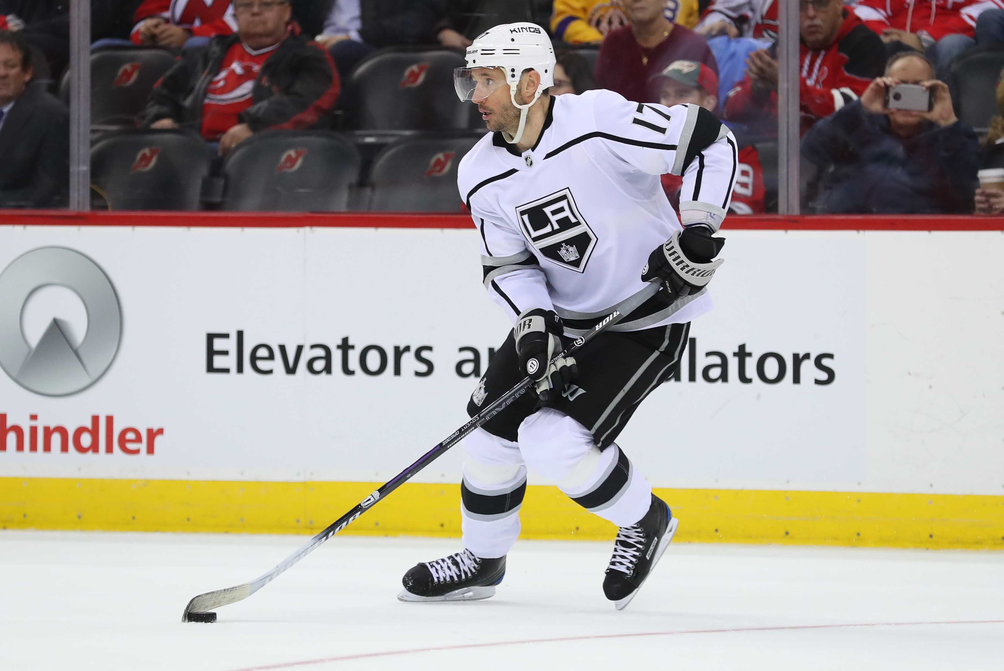 Feb 5, 2019; Newark, NJ, USA; Los Angeles Kings left wing Ilya Kovalchuk (17) skates with the puck during the second period of their game against the New Jersey Devils at Prudential Center. Mandatory Credit: Ed Mulholland-USA TODAY Sports / Ed Mulholland