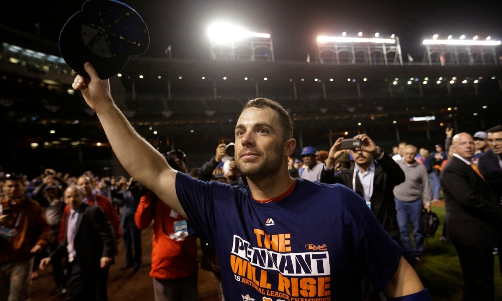 New York Mets' David Wright waves to the crowd after Game 4 of the National League baseball championship series against the Chicago Cubs Wednesday, Oct. 21, 2015, in Chicago. The Mets won 8-3 to advance to the World Series. (AP Photo/David Goldman) / David Goldman/AP