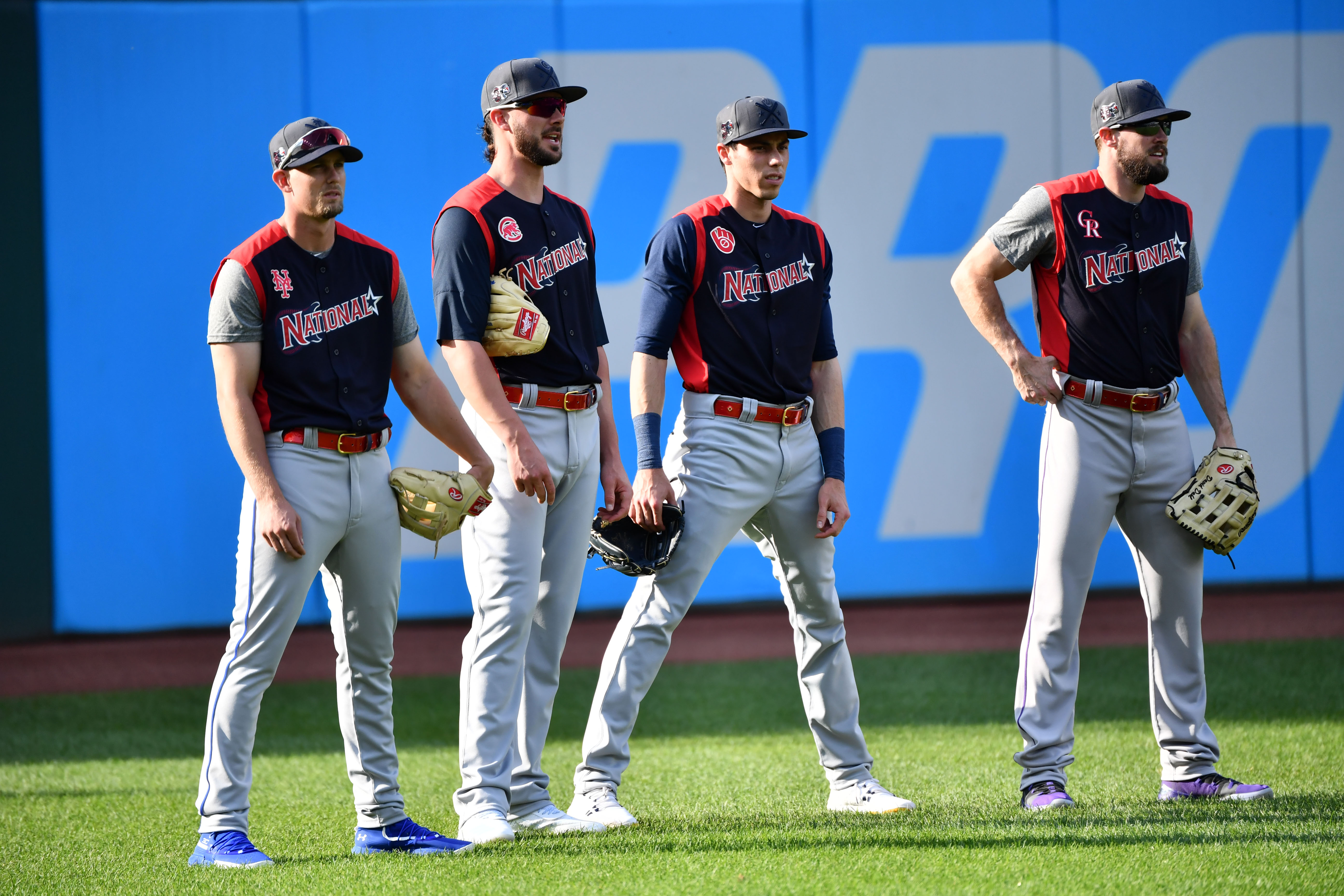Jul 9, 2019; Cleveland, OH, USA; (From left to right) National League outfielder Jeff McNeil (6) of the New York Mets, infielder Kris Bryant (17) of the Chicago Cubs, outfielder Christian Yelich (22) of the Milwaukee Brewers, and outfielder David Dahl (26) of the Colorado Rockies prior to the 2019 MLB All Star Game at Progressive Field. Mandatory Credit: Ken Blaze-USA TODAY Sports / Ken Blaze