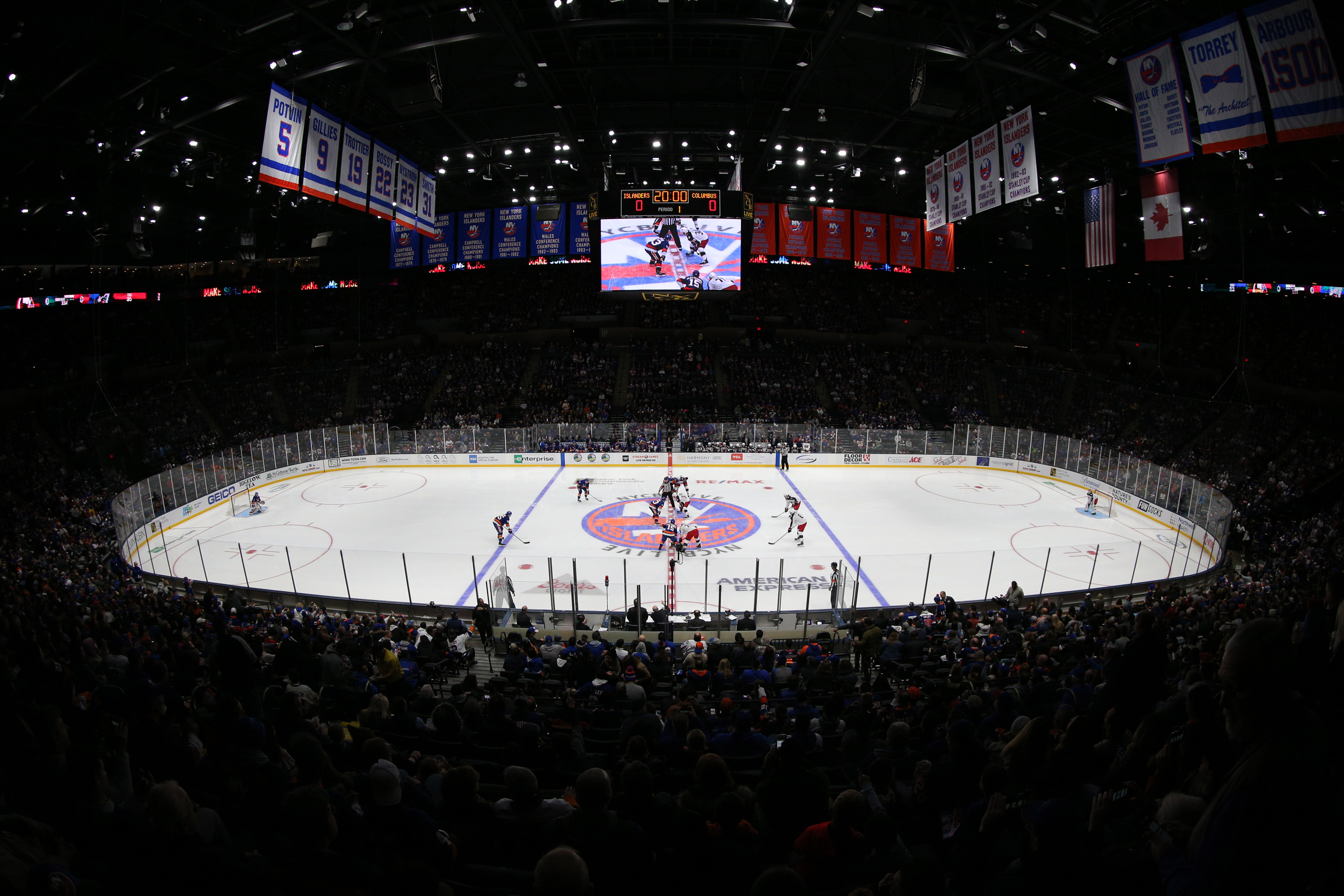 Dec 1, 2018; Uniondale, NY, USA; General view of the opening puck drop between the New York Islanders and the Columbus Blue Jackets during the first period at Nassau Veterans Memorial Coliseum. Mandatory Credit: Brad Penner-USA TODAY Sports / Brad Penner
