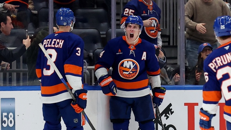 New York Islanders center Bo Horvat (14) celebrates his goal against the Colorado Avalanche with defenseman Adam Pelech (3) and center Mathew Barzal (13) and defenseman Scott Perunovich (26) during the third period at UBS Arena. / Brad Penner-Imagn Images