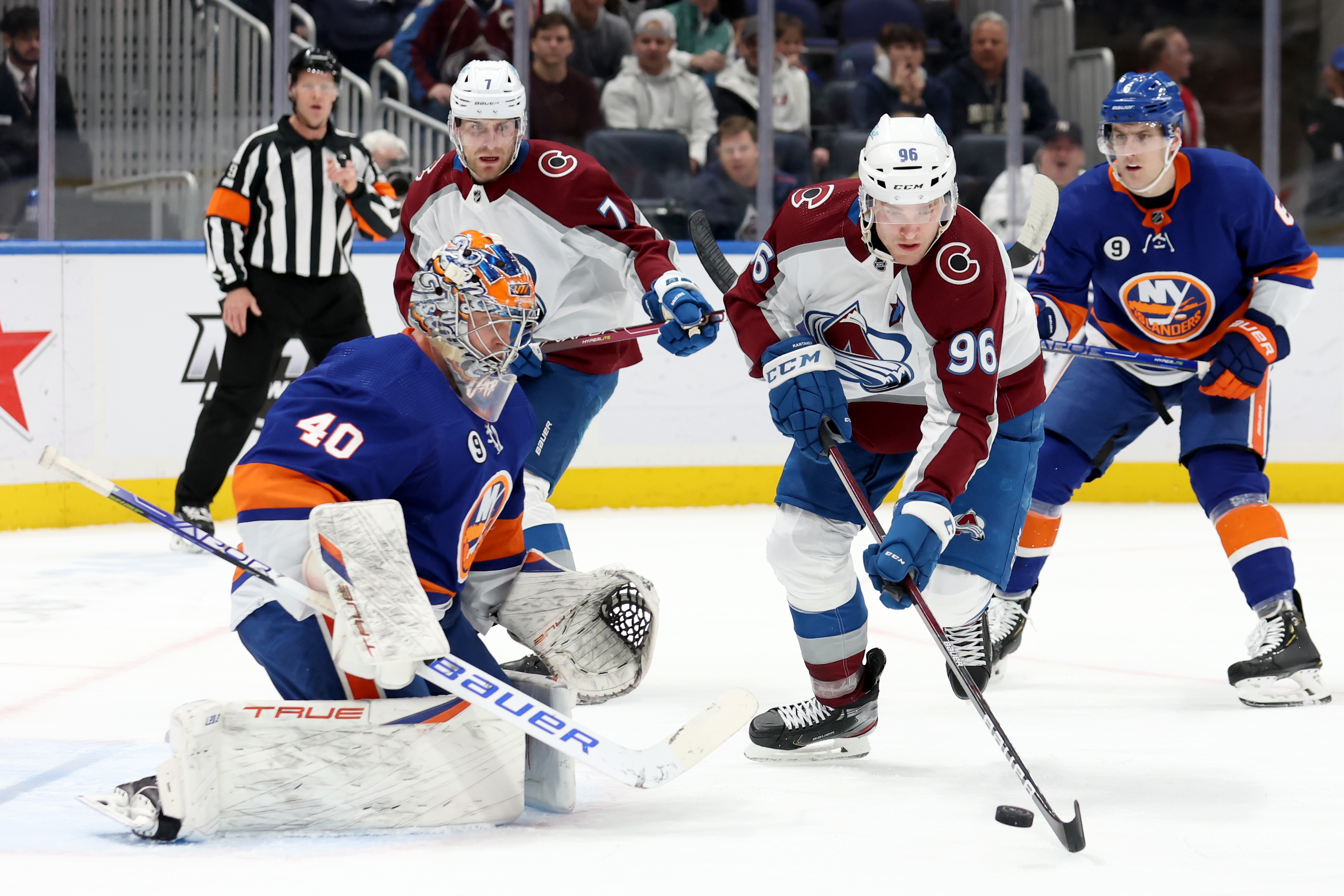 Islanders lose 5-4 at Avalanche as late comeback bid falls shortAfter 1-1 tie through two, Colorado outlasted New York 4-3 in third3/8/2022, 3:50 AMMar 7, 2022; Elmont, New York, USA; Colorado Avalanche right wing Mikko Rantanen (96) plays the puck in front of New York Islanders goaltender Semyon Varlamov (40) during the first period at UBS Arena. Mandatory Credit: Brad Penner-USA TODAY Sports / © Brad Penner-USA TODAY Sports