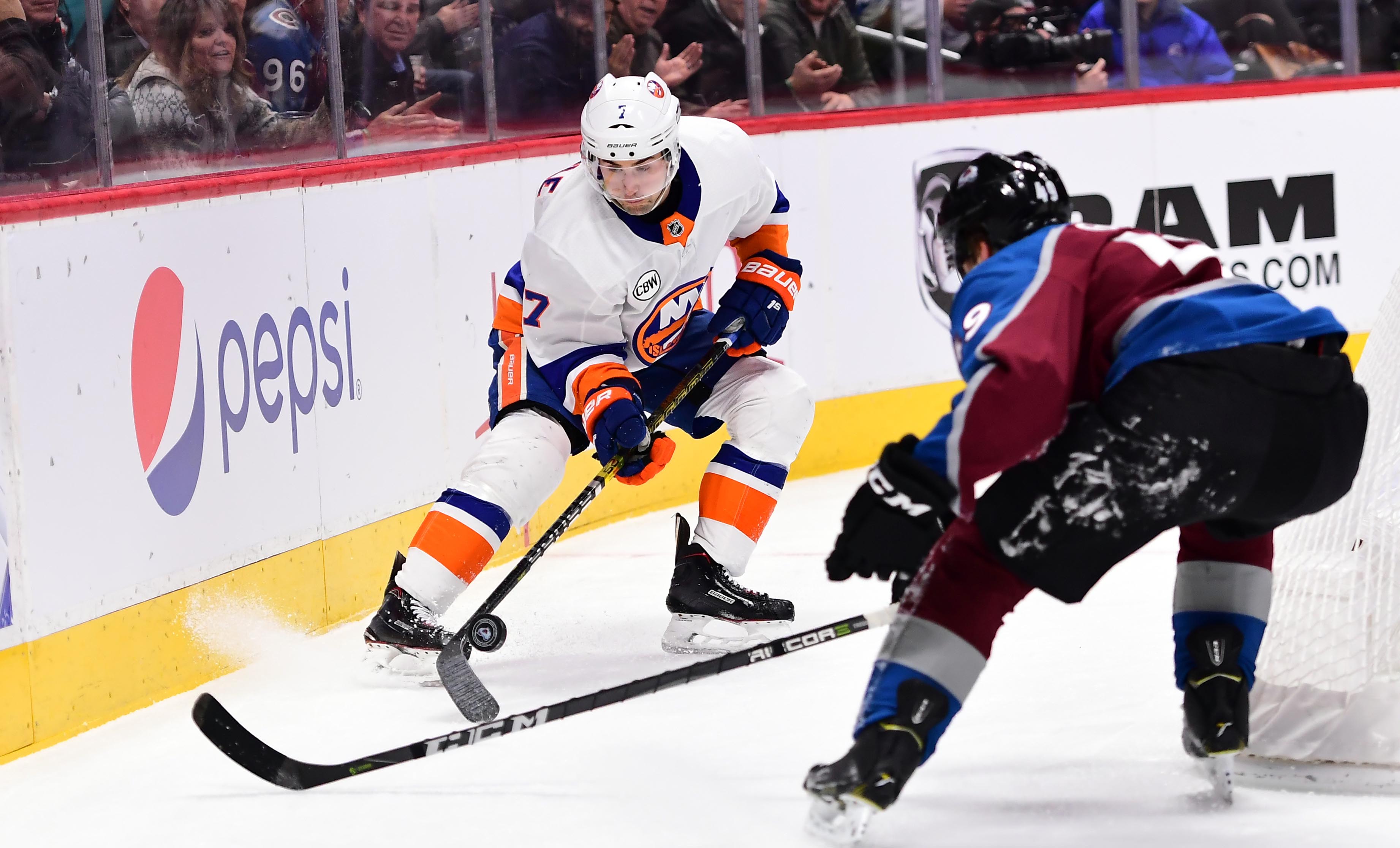 New York Islanders right wing Jordan Eberle controls the puck behind the Colorado Avalanche net in the first period at the Pepsi Center. / Ron Chenoy/USA TODAY Sports