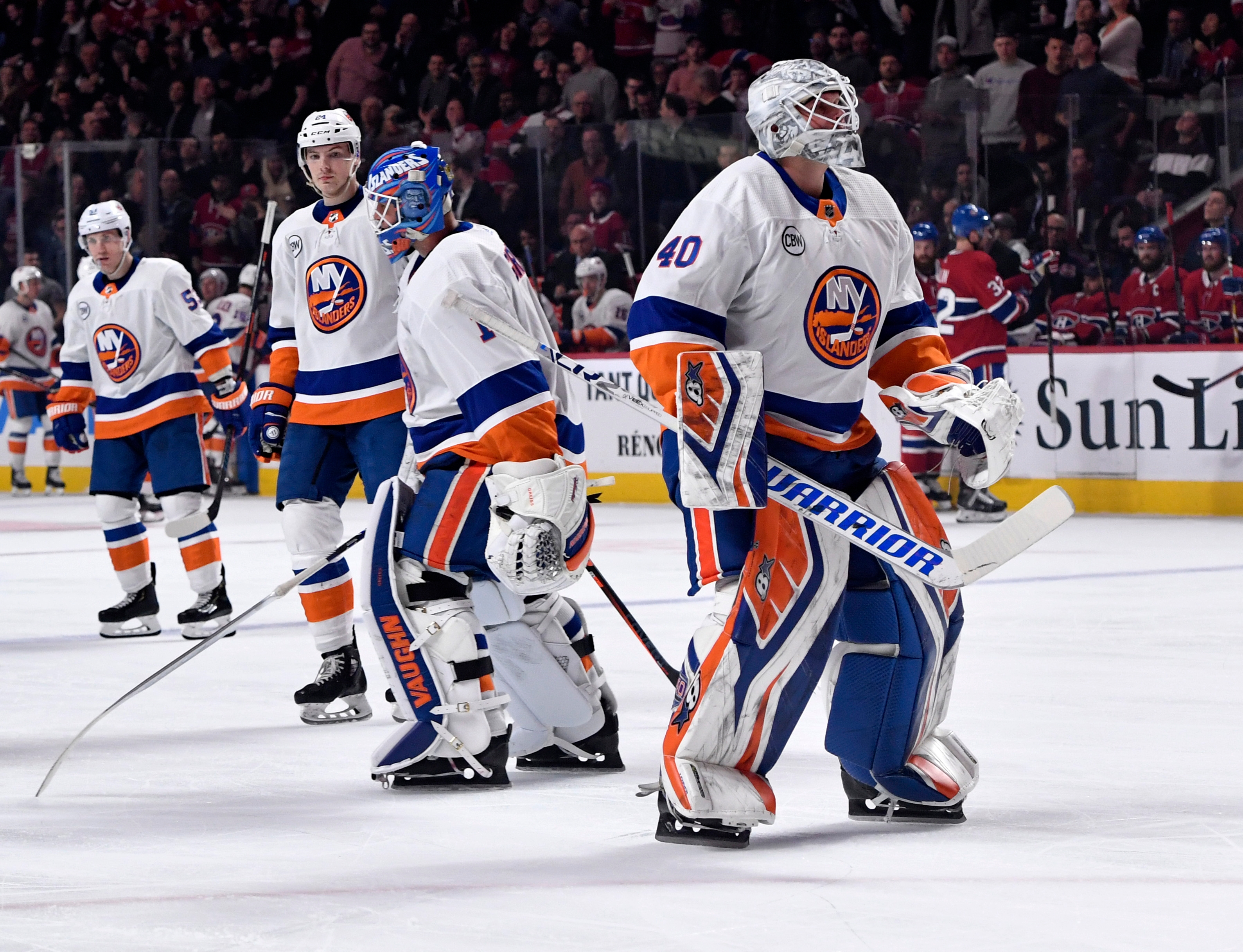 Mar 21, 2019; Montreal, Quebec, CAN; New York Islanders goalie Robin Lehner (40) replaces teammate Thomas Greiss (1) during the second period of the game against the Montreal Canadiens at the Bell Centre. Mandatory Credit: Eric Bolte-USA TODAY Sports / Eric Bolte
