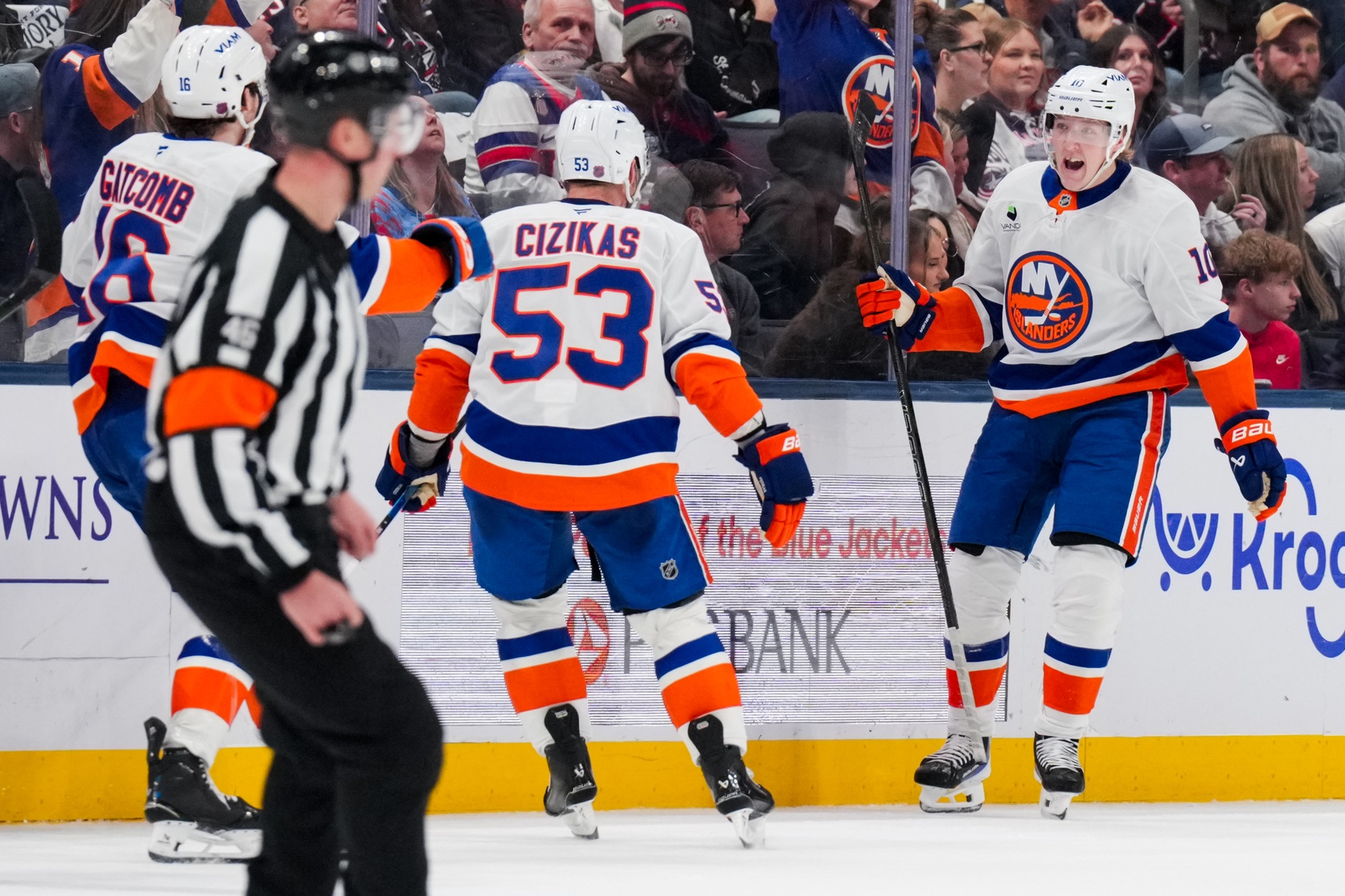 Islanders stage comeback after two-goal deficit, beat Blue Jackets in OT, 4-3Simon Holmstrom was overtime hero3/1/2026, 2:19 AMAssociated PressNew York Islanders right wing Simon Holmstrom (10) celebrates with teammates after scoring the game-winning goal against the Columbus Blue Jackets in the overtime period at Nationwide Arena. / Aaron Doster-Imagn Images
