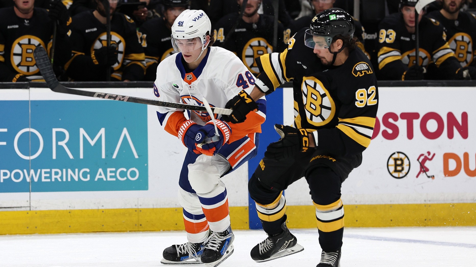 Islanders allow five unanswered goals in 5-2 loss to BruinsIslanders scored two goals in first five minutes of game10/29/2025, 2:15 AMAssociated PressOct 28, 2025; Boston, Massachusetts, USA; New York Islanders defenseman Matthew Schaefer (48) lifts the stick of Boston Bruins center Marat Khusnutdinov (92) to get the puck during the second period at TD Garden. / Winslow Townson-Imagn Images