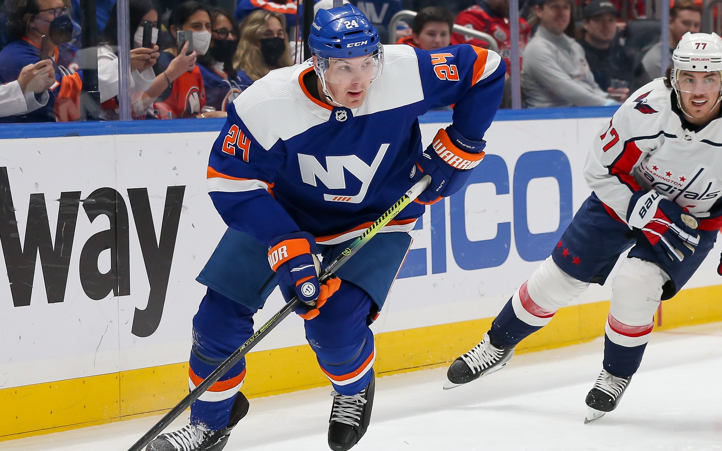 Semyon Varlamov makes 34 saves, but Islanders shut out by Capitals, 2-0Tom Wilson and Alex Ovechkin scored as Isles had just 23 shots on net1/15/2022, 10:06 PMJan 15, 2022; Elmont, New York, USA; New York Islanders defenseman Scott Mayfield (24) skates the puck past Washington Capitals right wing T.J. Oshie (77) during the first period at UBS Arena. Mandatory Credit: Tom Horak-USA TODAY Sports / © Tom Horak-USA TODAY Sports