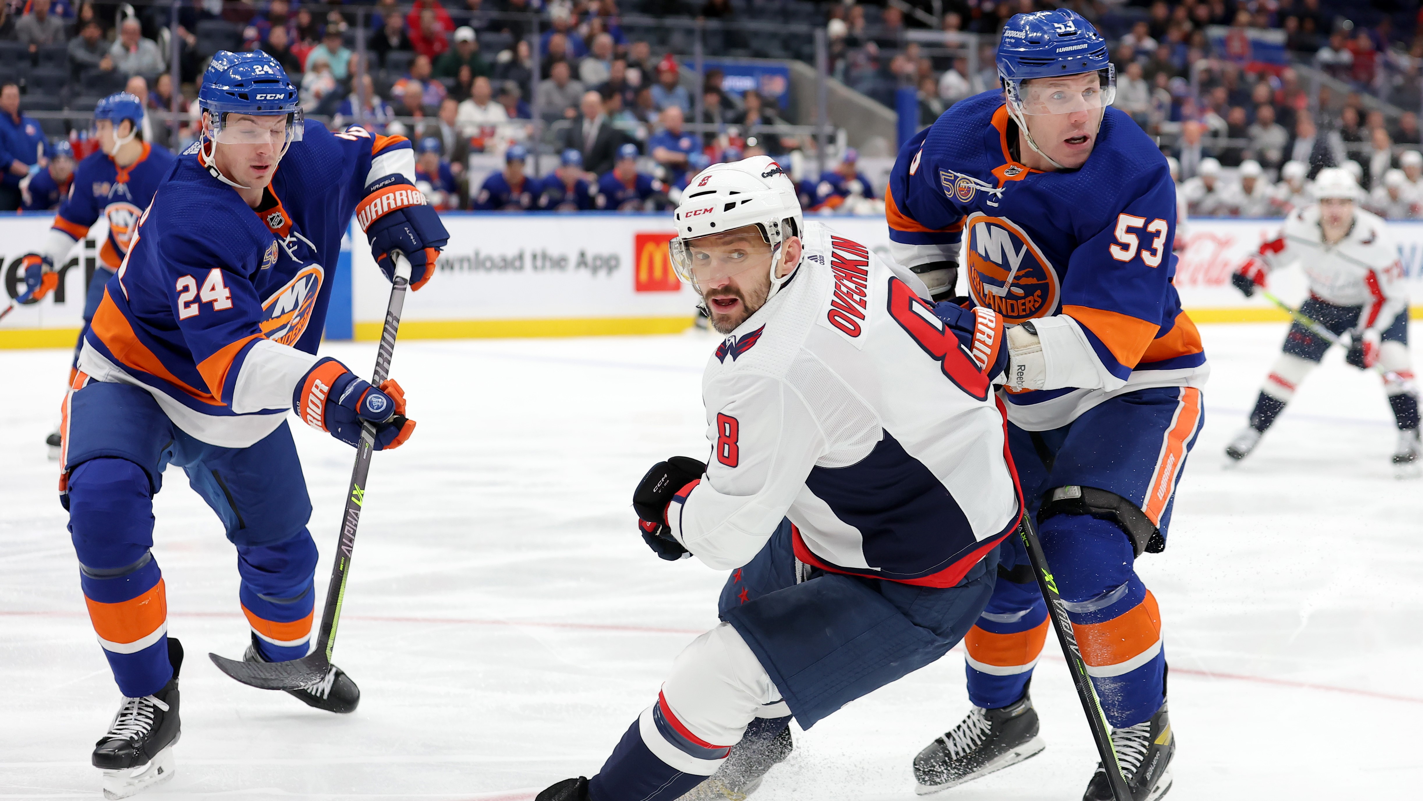 Islanders blow 3-0 lead in OT loss to CapitalsNew York has dropped five of its past six games1/17/2023, 3:47 AMJan 16, 2023; Elmont, New York, USA; Washington Capitals left wing Alex Ovechkin (8) skates against New York Islanders center Casey Cizikas (53) and defenseman Scott Mayfield (24) during the first period at UBS Arena. Mandatory Credit: Brad Penner-USA TODAY Sports / © Brad Penner-USA TODAY Sports