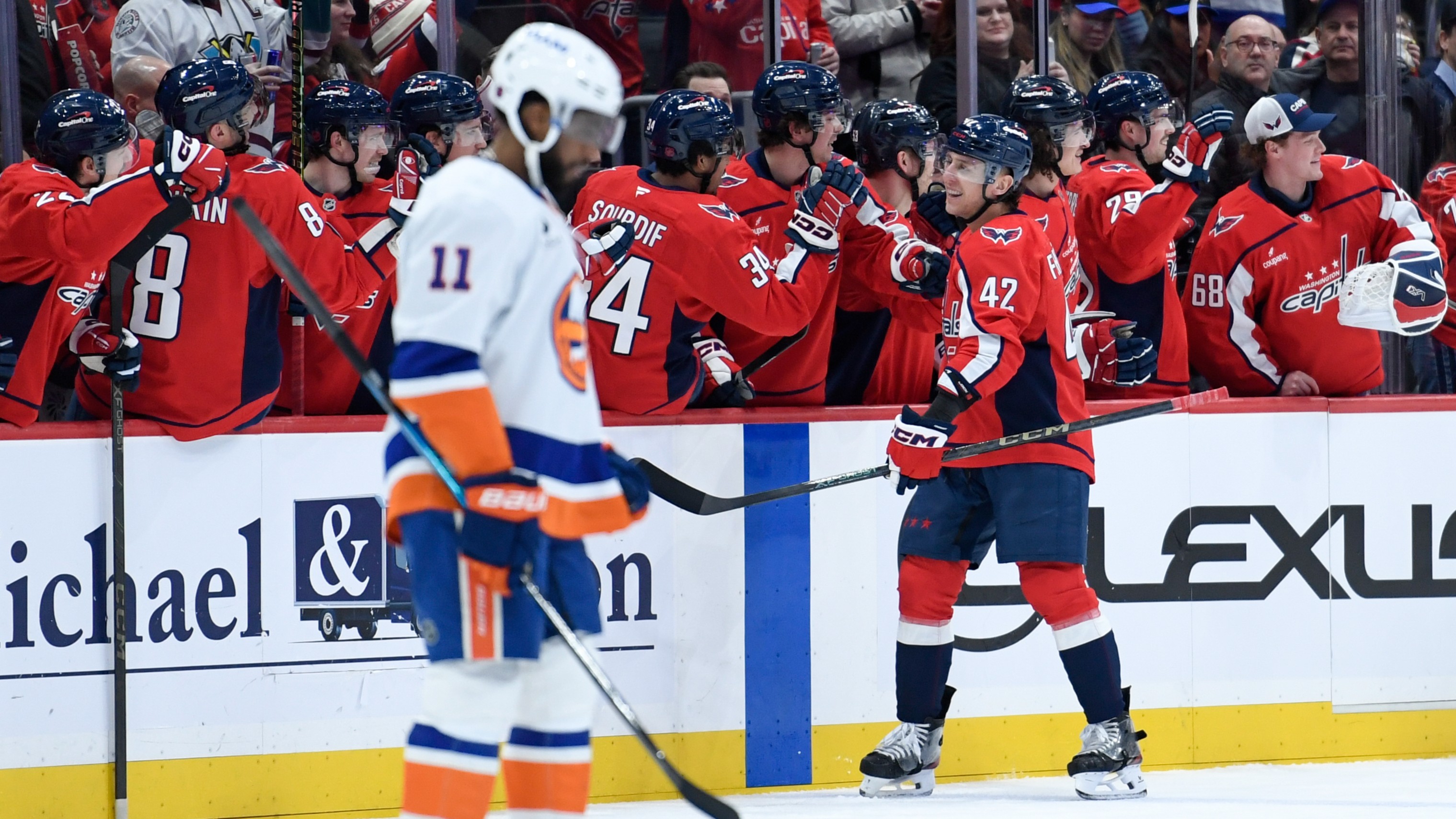 Feb 2, 2026; Washington, District of Columbia, USA; Washington Capitals defenseman Martin Fehervary (42) celebrates with teammates after scoring a goal against the New York Islanders during the second period at Capital One Arena / Hannah Foslien-Imagn Images