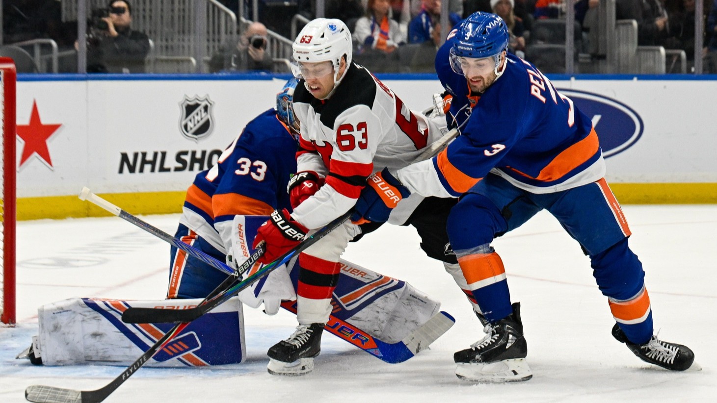 Dec 23, 2025; Elmont, New York, USA; New York Islanders defenseman Adam Pelech (3) and New Jersey Devils left wing Jesper Bratt (63) battle for the puck in front of Islanders goaltender David Rittich (33)during the first period at UBS Arena. / Dennis Schneidler-Imagn Images