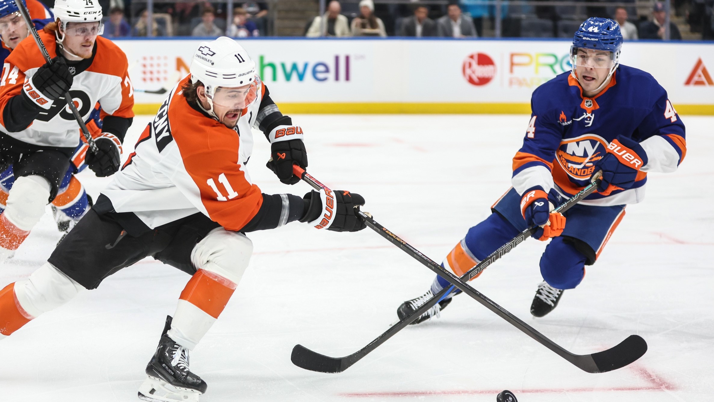 Islanders drop second in a row with 5-3 loss to FlyersNew York allowed five goals in last two periods1/17/2025, 3:36 AMAssociated PressJan 16, 2025; Elmont, New York, USA; Philadelphia Flyers right wing Travis Konecny (11) passes the puck past New York Islanders center Jean-Gabriel Pageau (44) in the first period at UBS Arena. / Wendell Cruz-Imagn Images