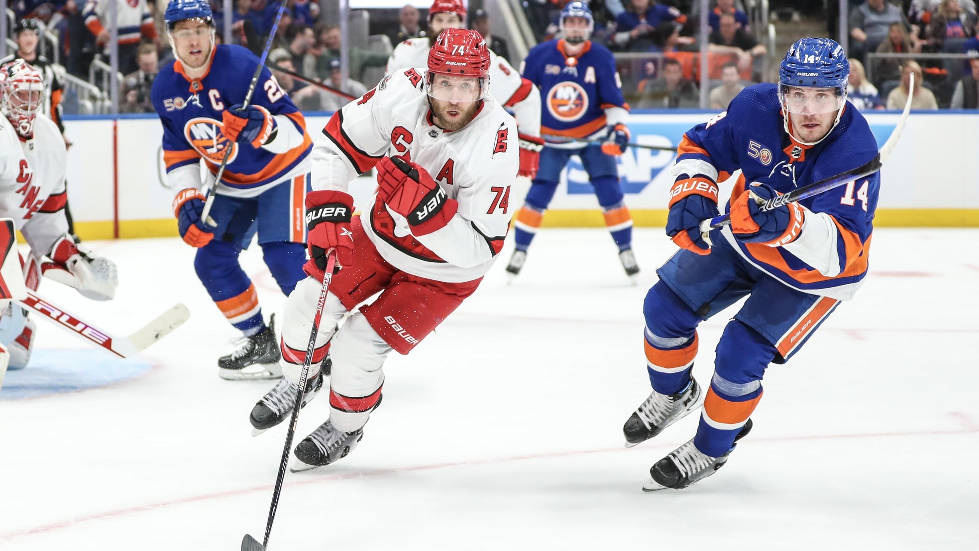 Apr 28, 2023; Elmont, New York, USA; Carolina Hurricanes defenseman Jaccob Slavin (74) and New York Islanders center Bo Horvat (14) chase the puck in game six of the first round of the 2023 Stanley Cup Playoffs at UBS Arena. / Wendell Cruz-USA TODAY Sports