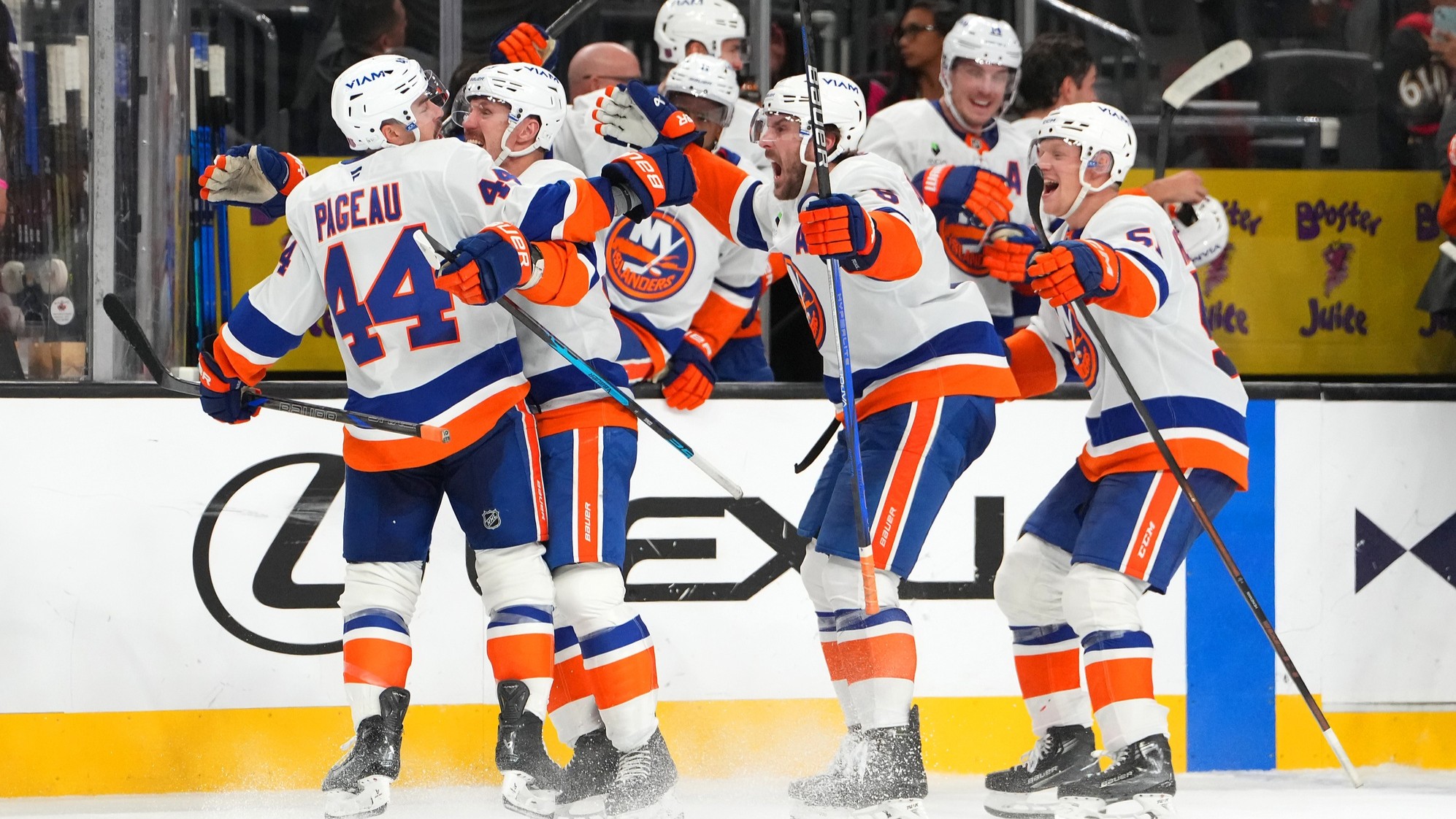 Nov 13, 2025; Las Vegas, Nevada, USA; New York Islanders center Jean-Gabriel Pageau (44) celebrates with team mates after scoring a short-handed goal against the Vegas Golden Knights during an overtime period to give the Islanders a 4-3 victory at T-Mobile Arena. / Stephen R. Sylvanie-Imagn Images