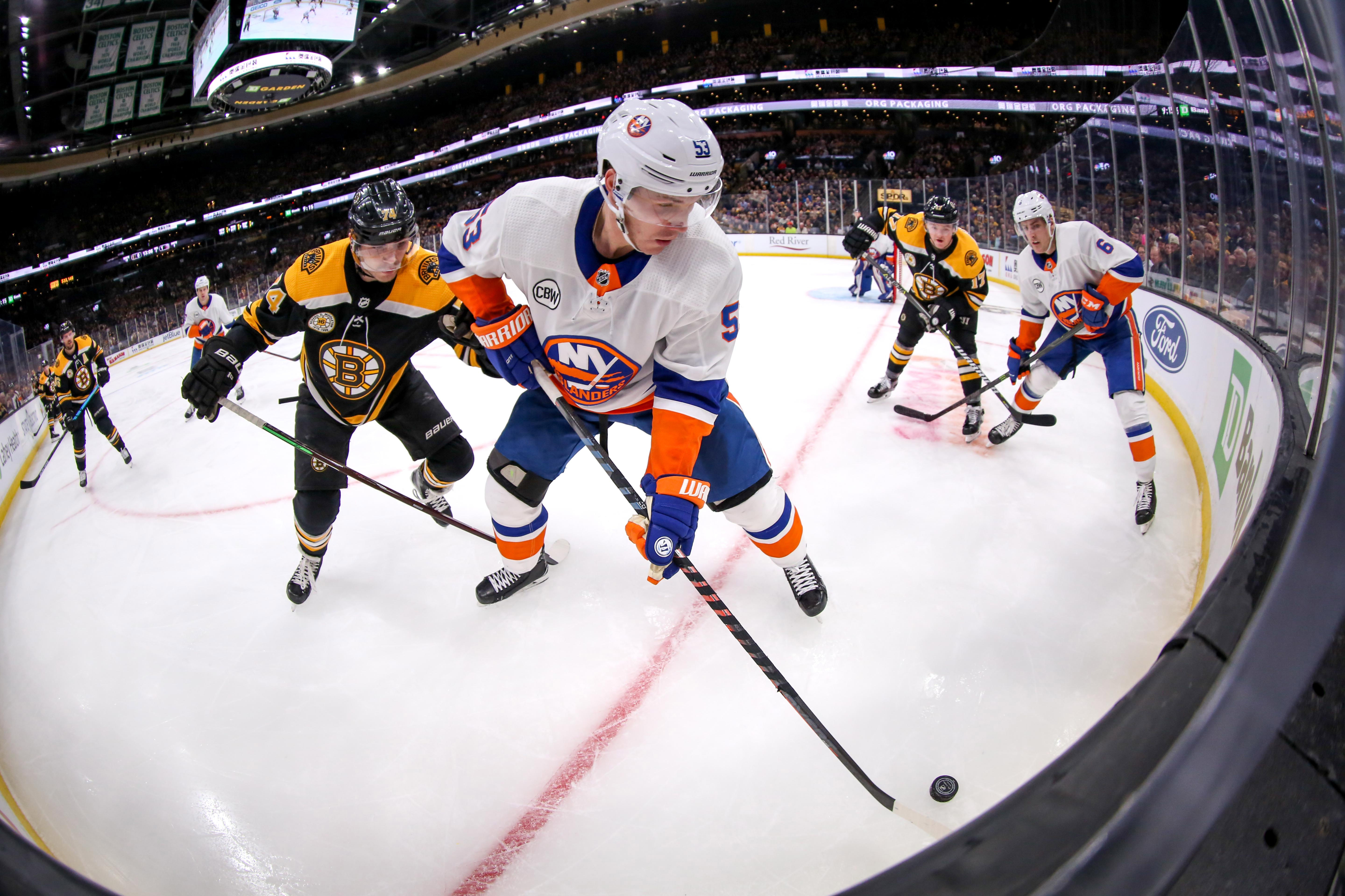 Nov 29, 2018; Boston, MA, USA; New York Islanders center Casey Cizikas (53) handles the puck against the Boston Bruins during the second period at TD Garden. Mandatory Credit: Paul Rutherford-USA TODAY Sports / Paul Rutherford