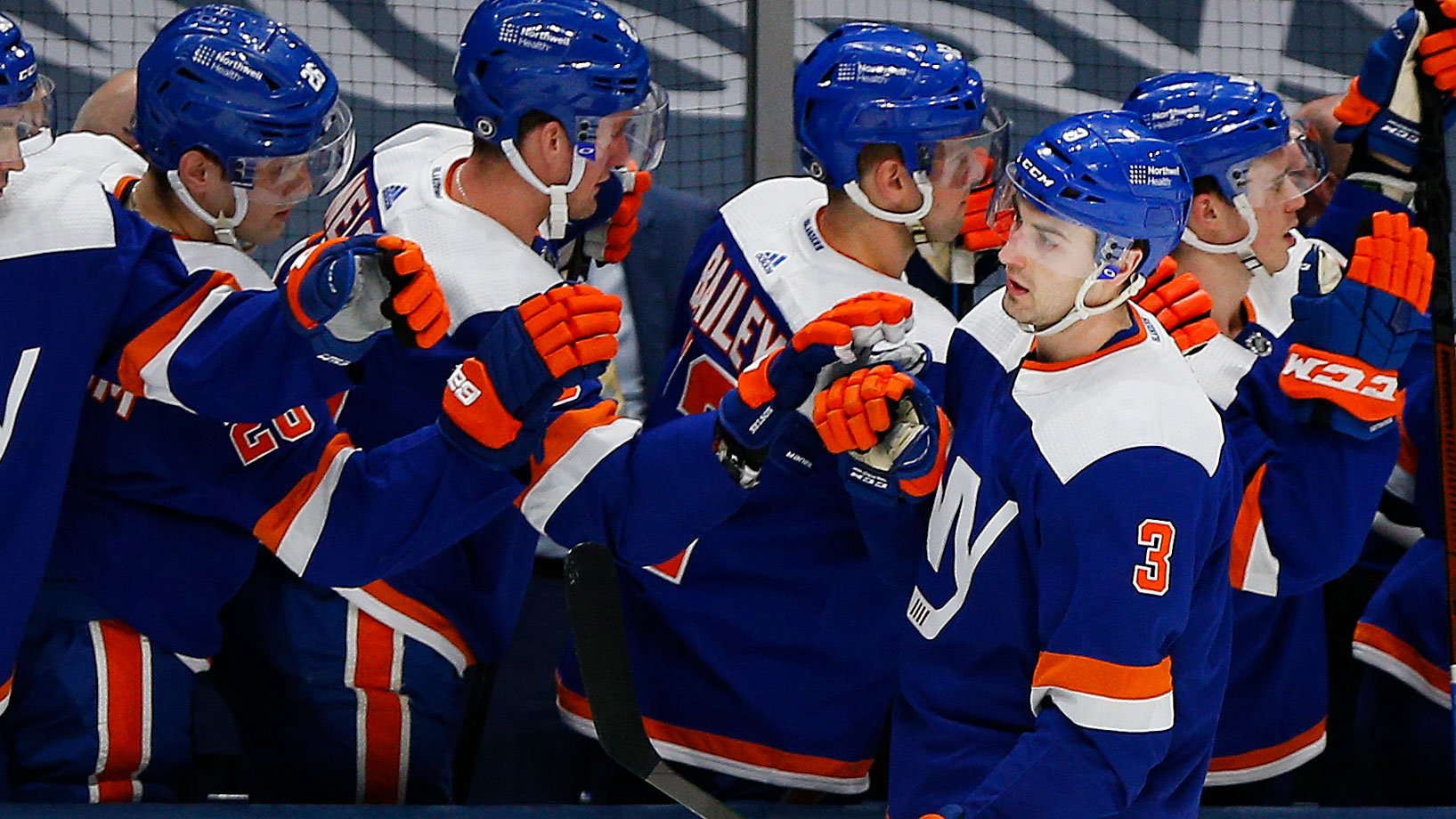 Mar 11, 2021; Uniondale, New York, USA; New York Islanders defenseman Adam Pelech (3) is congratulated after scoring a goal against the New Jersey Devils during the first period at Nassau Veterans Memorial Coliseum. / Andy Marlin-USA TODAY Sports