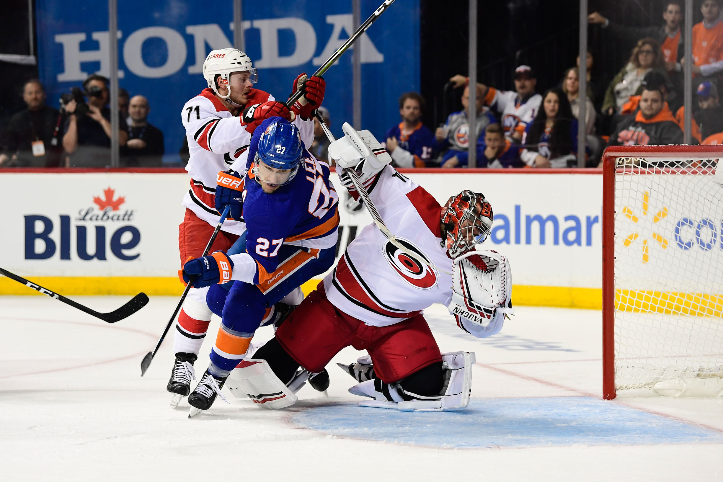 Apr 26, 2019; Brooklyn, NY, USA; Carolina Hurricanes goalie Petr Mrazek (34) is knocked over by New York Islanders left wing Anders Lee (27) during the second period in game one of the second round of the 2019 Stanley Cup Playoffs at Barclays Center. Mandatory Credit: Catalina Fragoso-USA TODAY Sports / Catalina Fragoso