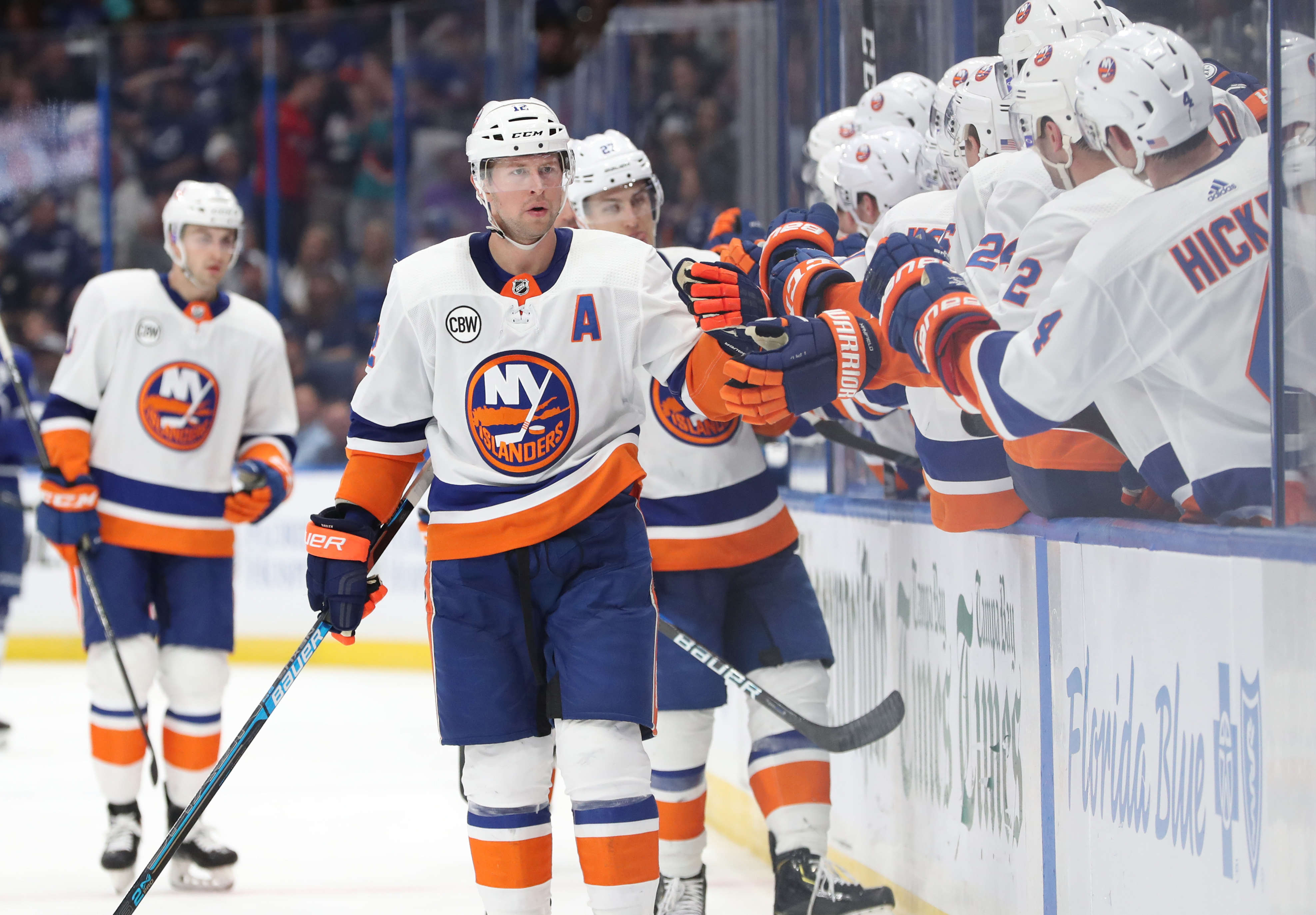 Nov 8, 2018; Tampa, FL, USA; New York Islanders right wing Josh Bailey (12) is congratulated by teammates after scoring a goal against the Tampa Bay Lightning during the third period at Amalie Arena. Mandatory Credit: Kim Klement-USA TODAY Sports / Kim Klement