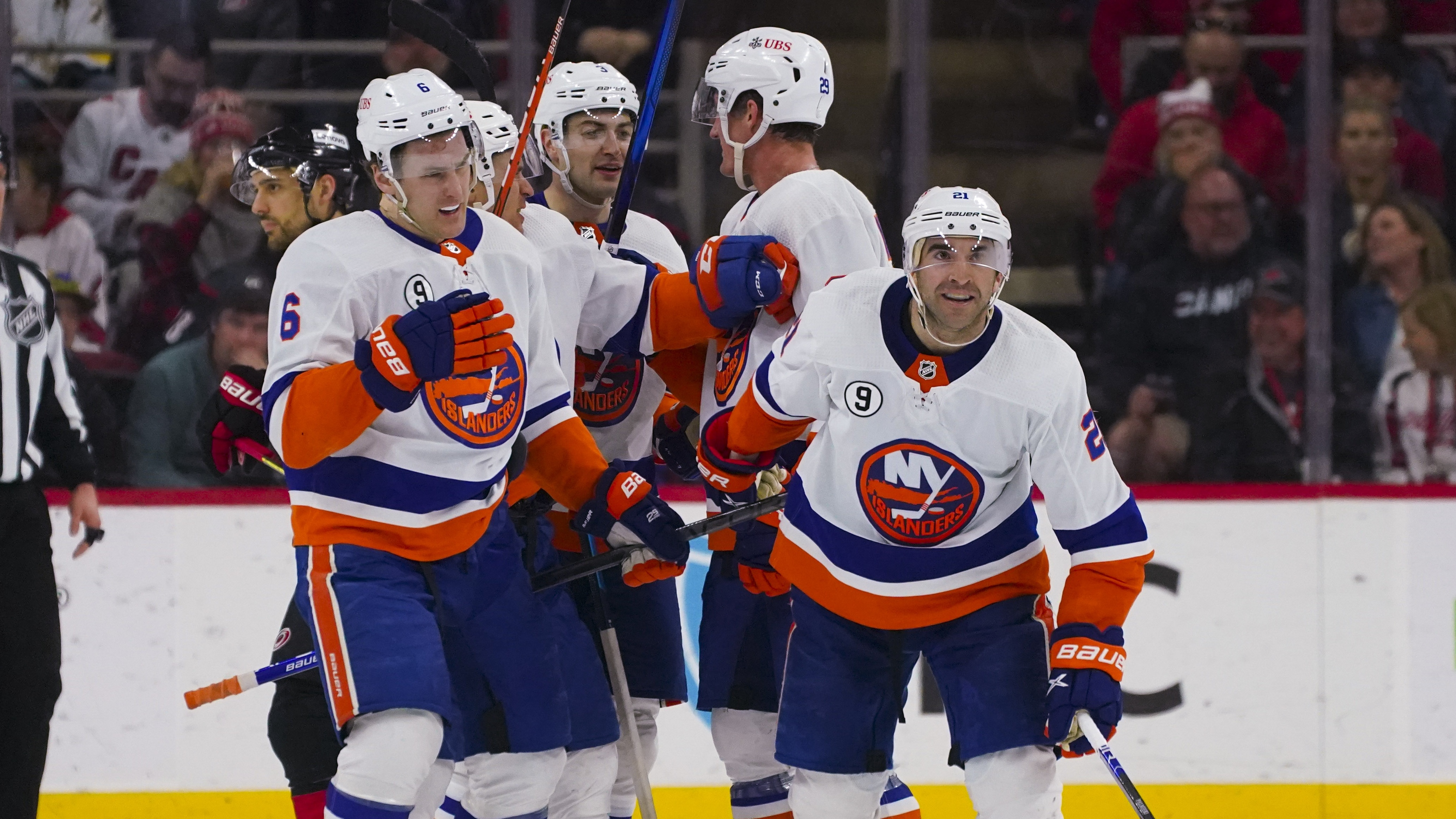 Kyle Palmieri rescues Islanders in final-minute win at HurricanesPalmieri scored go-ahead goal with 14.1 seconds left4/9/2022, 1:56 AMApr 8, 2022; Raleigh, North Carolina, USA; New York Islanders right wing Kyle Palmieri (21) is congratulated by defenseman Ryan Pulock (6) center Brock Nelson (29) defenseman Adam Pelech (3) and left wing Zach Parise (11) after his goal against the Carolina Hurricanes during the third period at PNC Arena. Mandatory Credit: James Guillory-USA TODAY Sports / © James Guillory-USA TODAY Sports