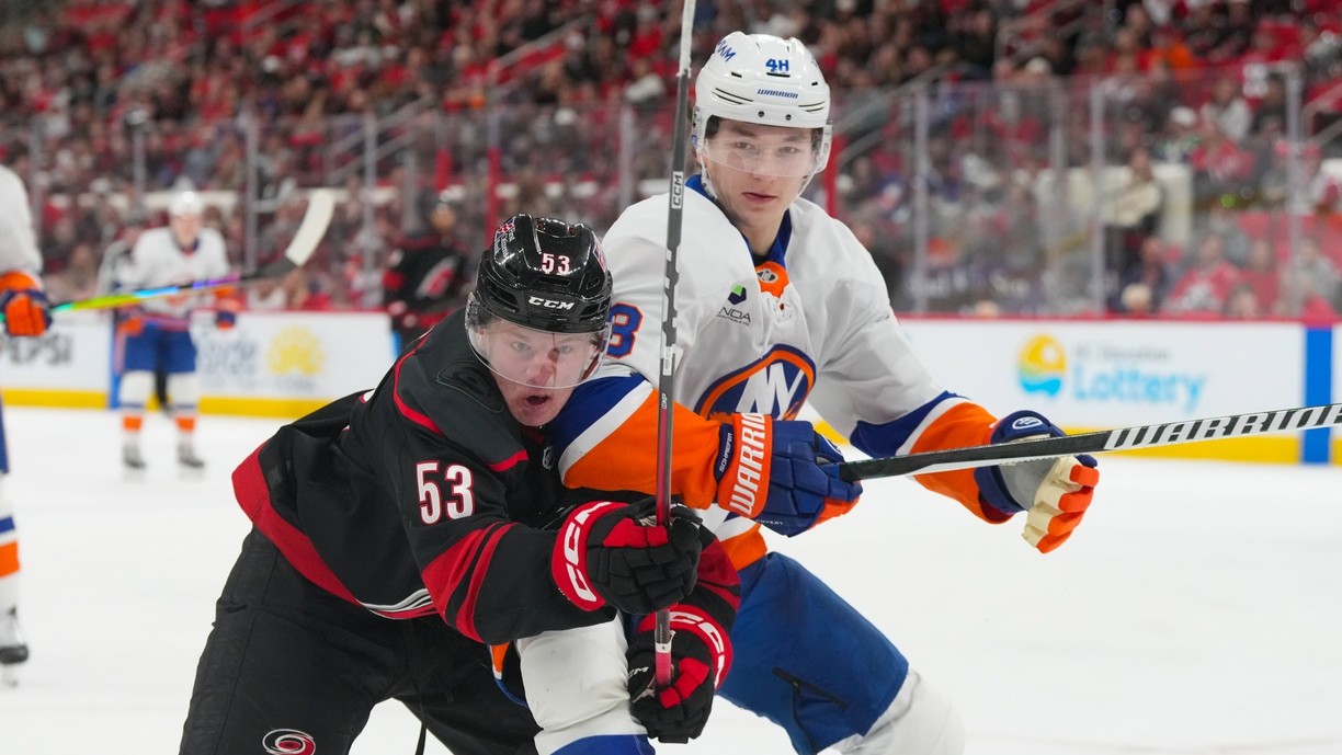 Islanders' losing streak reaches four games after 4-3 defeat to HurricanesIslanders' current losing streak is longest of season4/5/2026, 2:06 AMAssociated PressApr 4, 2026; Raleigh, North Carolina, USA; Carolina Hurricanes right wing Jackson Blake (53) and New York Islanders defenseman Matthew Schaefer (48) chase after the puck during the third period at Lenovo Center. / James Guillory-Imagn Images