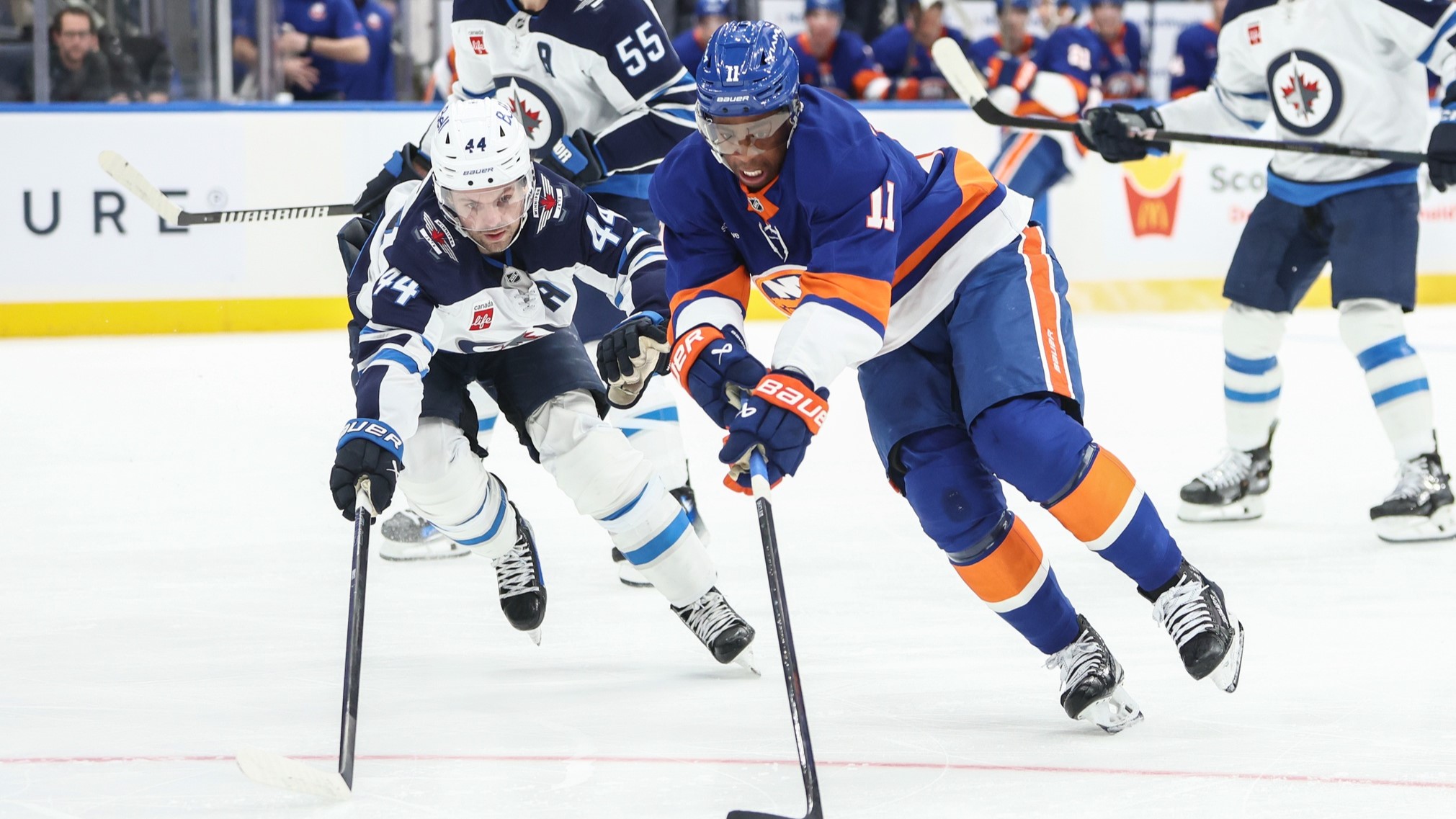 Islanders hold on for 3-2 win over NHL-leading JetsBrock Nelson recorded two points in the win3/5/2025, 3:32 AMAssociated PressMar 4, 2025; Elmont, New York, USA; Winnipeg Jets defenseman Josh Morrissey (44) and New York Islanders left wing Anthony Duclair (11) battle for control of the puck in the second period at UBS Arena. / Wendell Cruz-Imagn Images