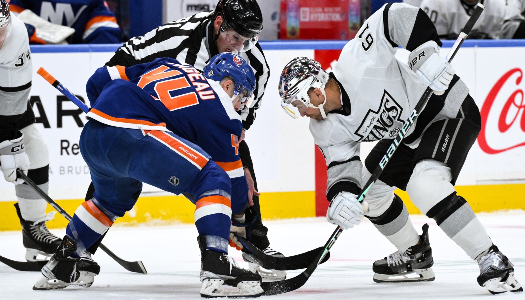 Anders Lee scores twice in third period, Islanders rally to win 3-2 over Kings in OTJean-Gabriel Pageau scored game-winner12/10/2023, 3:46 AMAssociated PressNew York Islanders center Jean-Gabriel Pageau (44) faces off against Los Angeles Kings center Trevor Lewis (61) during the first period at UBS Arena. / John Jones-USA TODAY Sports