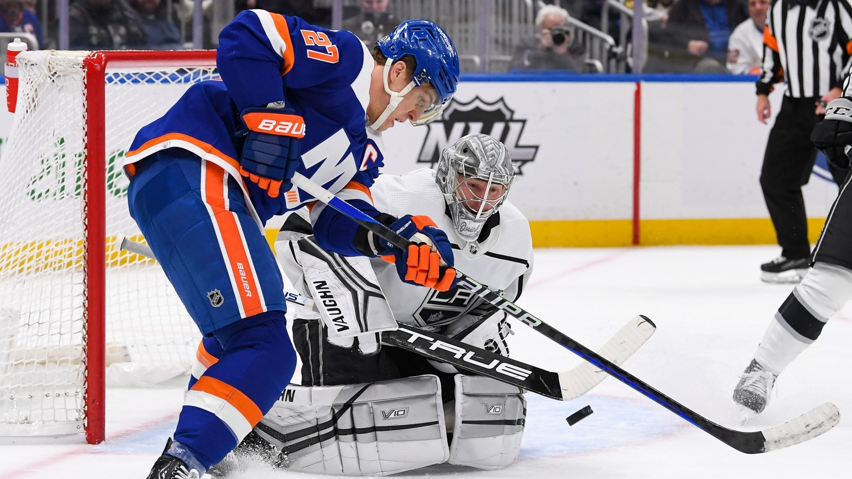 Feb 24, 2023; Elmont, New York, USA; New York Islanders left wing Anders Lee (27) attempts to deflect the puck in front of Los Angeles Kings goaltender Jonathan Quick (32) during the second period at UBS Arena. / Dennis Schneidler-USA TODAY Sports