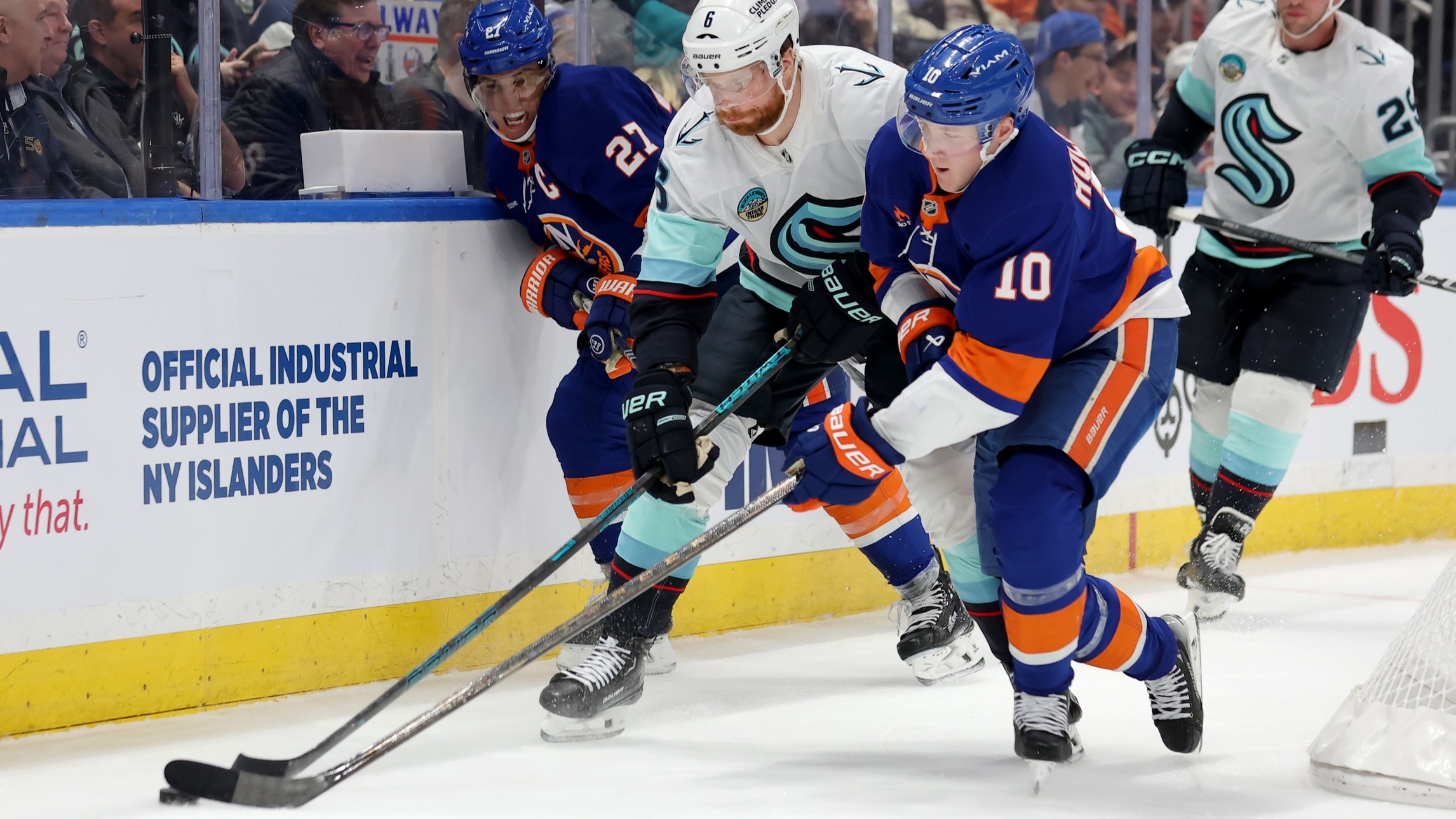 Dec 5, 2024; Elmont, New York, USA; Seattle Kraken defenseman Adam Larsson (6) fights for the puck against New York Islanders left wing Anders Lee (27) and right wing Simon Holmstrom (10) during the second period at UBS Arena. / Brad Penner-Imagn Images