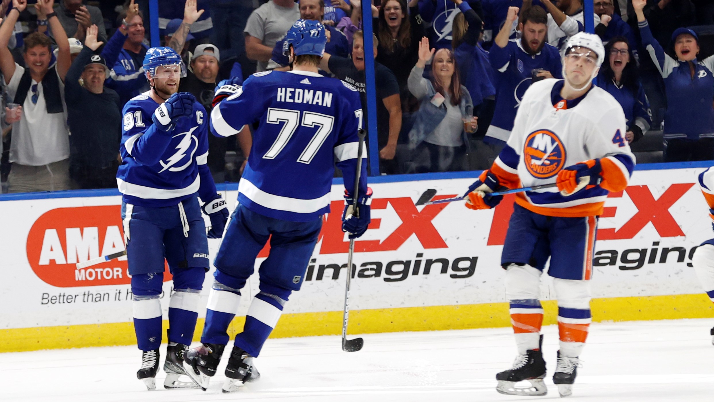 Nov 15, 2021; Tampa, Florida, USA; Tampa Bay Lightning center Steven Stamkos (91) is congratulated by defenseman Victor Hedman (77) as he scored a goal against the New York Islanders during the third period at Amalie Arena. Mandatory Credit: Kim Klement-USA TODAY Sports / Kim Klement-USA TODAY Sports