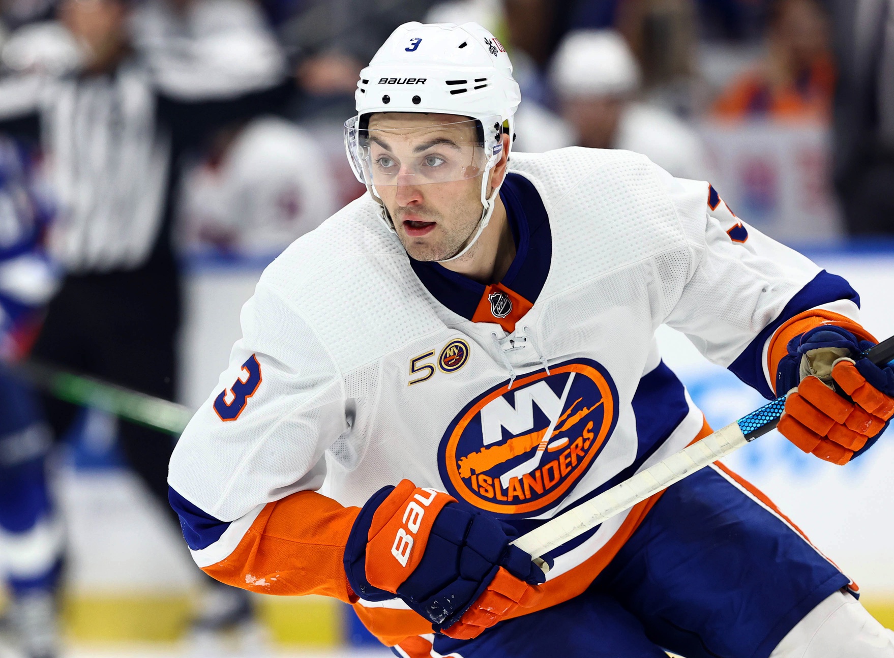 New York Islanders defenseman Adam Pelech (3) skates with the puck against the Tampa Bay Lightning during the third period at Amalie Arena. / Kim Klement-USA TODAY Sports