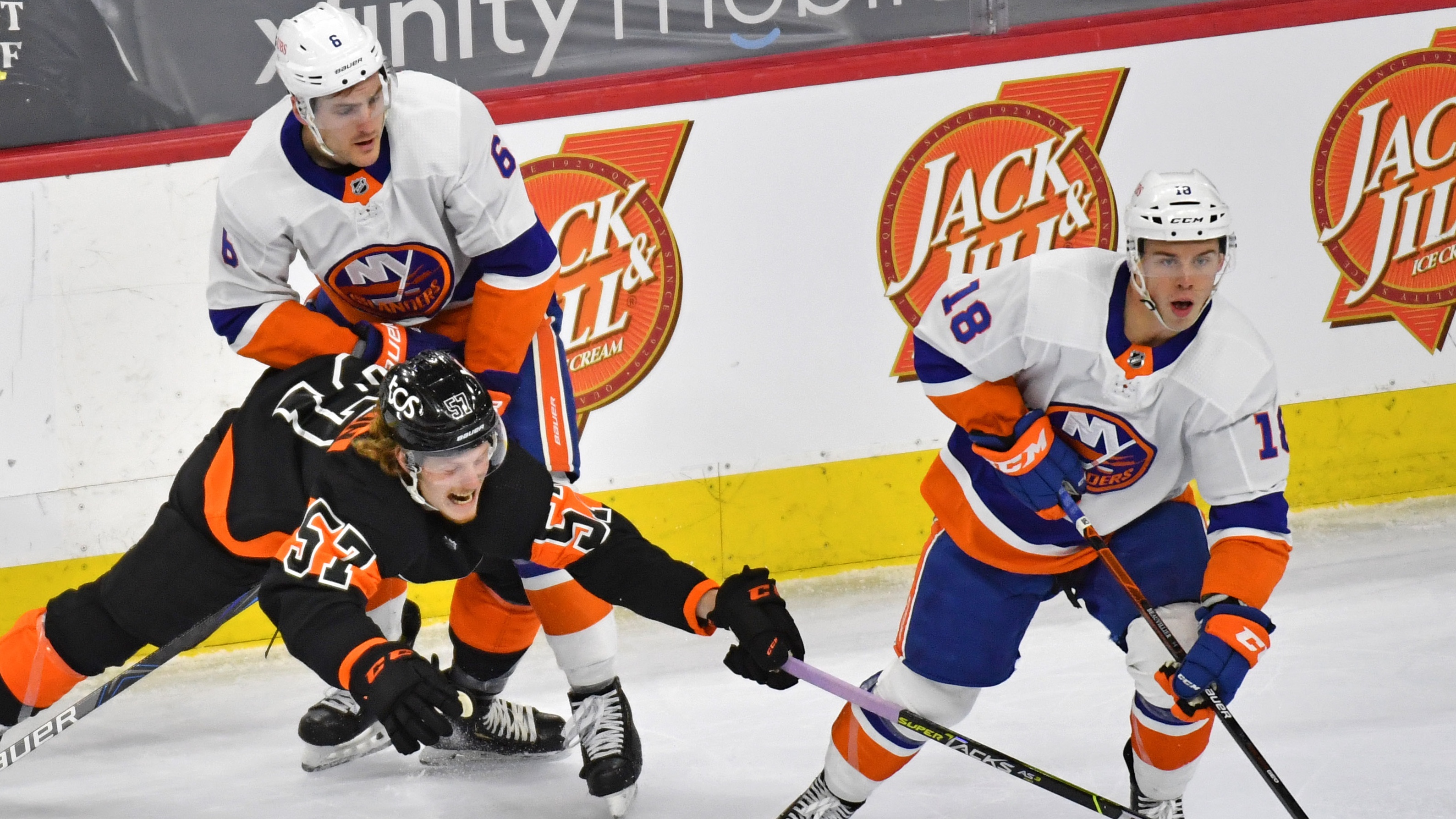 Nick Leddy's OT goal gives Islanders 1-0 victory over FlyersIllya Sorokin made 30 saves in the win4/19/2021, 1:47 AMApr 18, 2021; Philadelphia, Pennsylvania, USA; New York Islanders left wing Anthony Beauvillier (18) skates away with the puck from Philadelphia Flyers right wing Wade Allison (57) during the second period at Wells Fargo Center. / © Eric Hartline-USA TODAY Sports