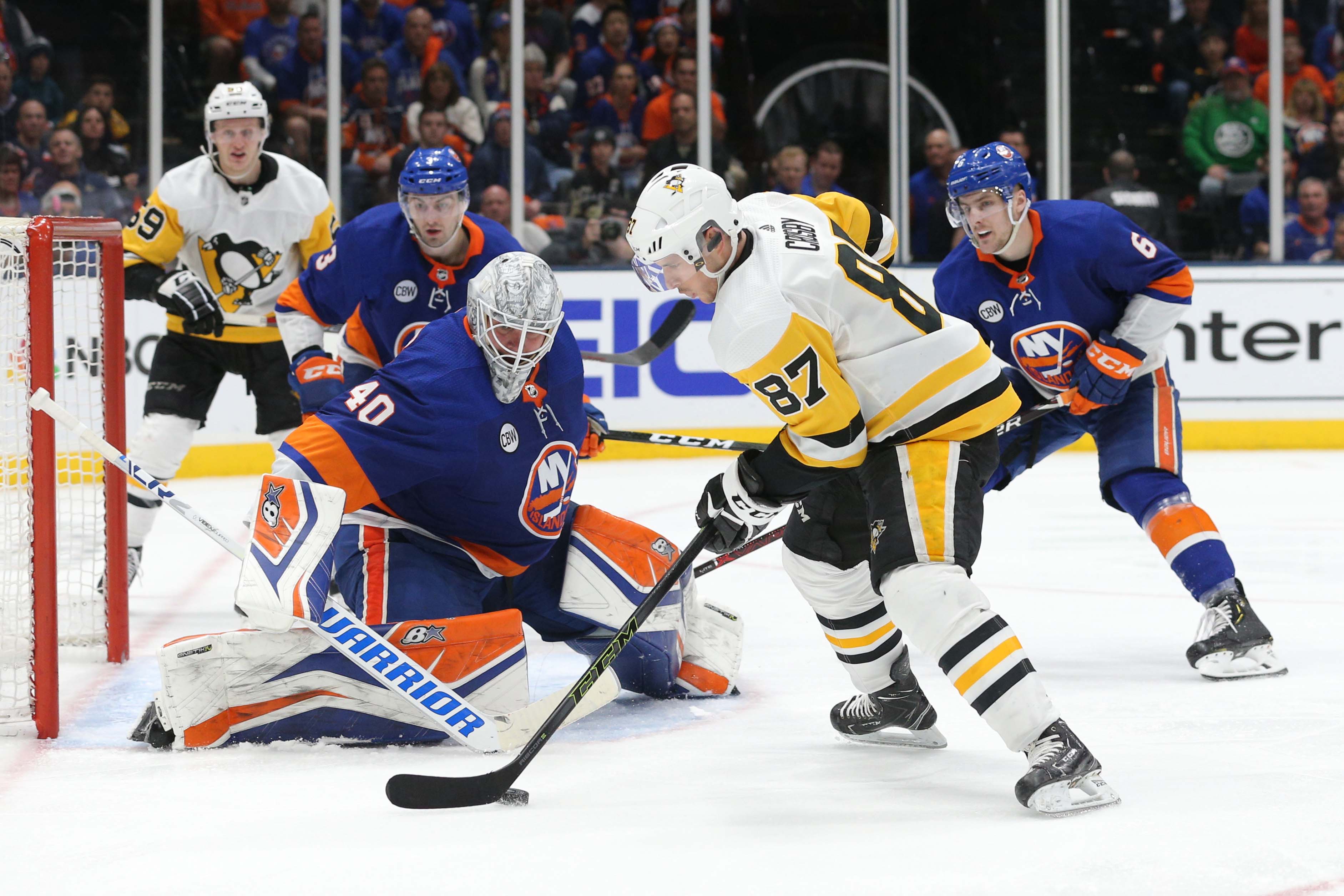 Apr 12, 2019; Uniondale, NY, USA; New York Islanders goalie Robin Lehner (40) makes a save against Pittsburgh Penguins center Sidney Crosby (87) during the third period of game two of the first round of the 2019 Stanley Cup Playoffs at Nassau Veterans Memorial Coliseum. Mandatory Credit: Brad Penner-USA TODAY Sports / Brad Penner