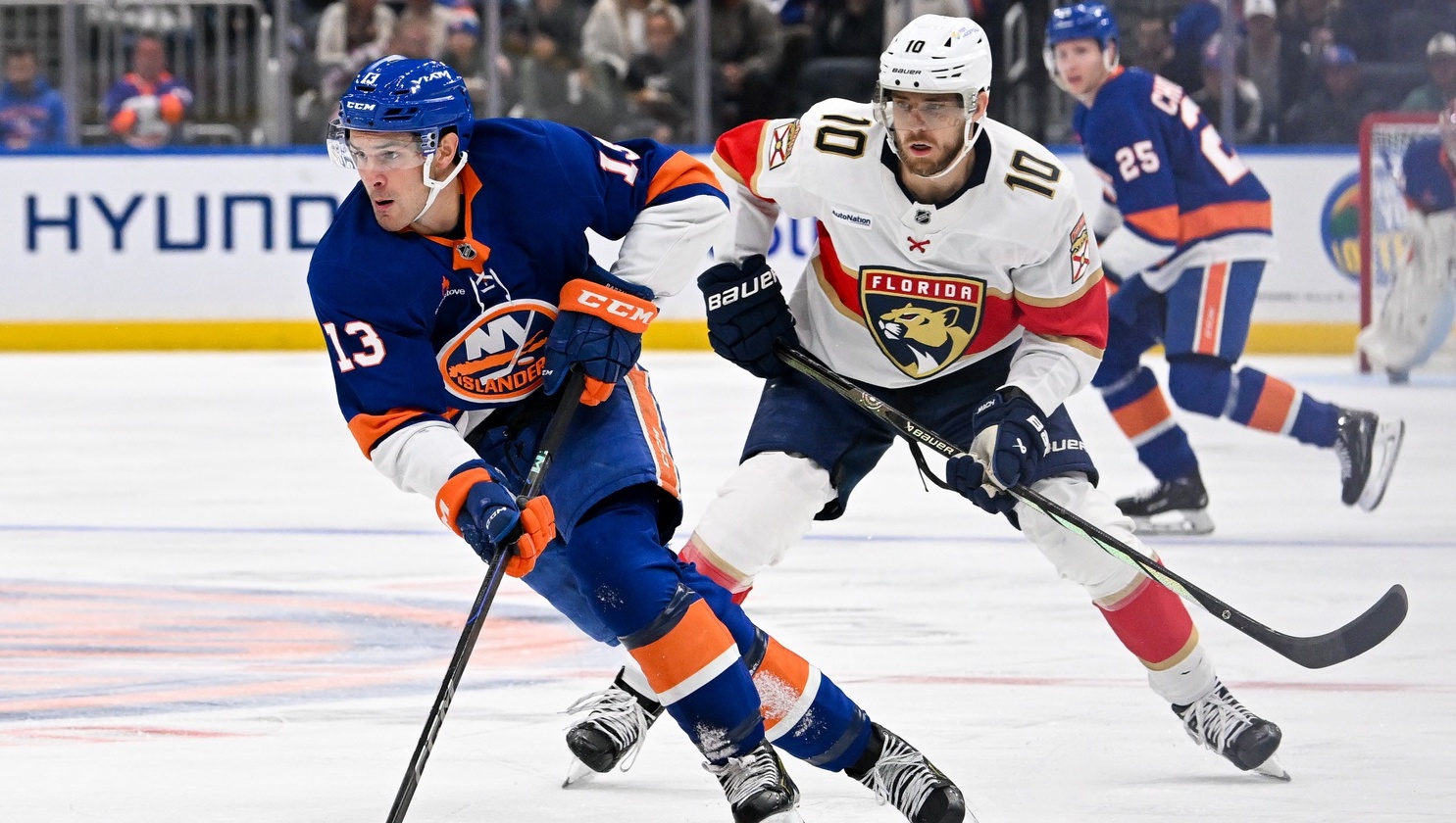 Islanders allow six unanswered in 6-3 loss to Panthers after taking three-goal, first-period leadGoalie Semyon Varlamov had night to forget behind net10/27/2024, 2:36 AMAssociated PressNew York Islanders center Mathew Barzal (13) skates across the blue line chased by Florida Panthers left wing A.J. Greer (10) during the second period at UBS Arena. / Dennis Schneidler-Imagn Images