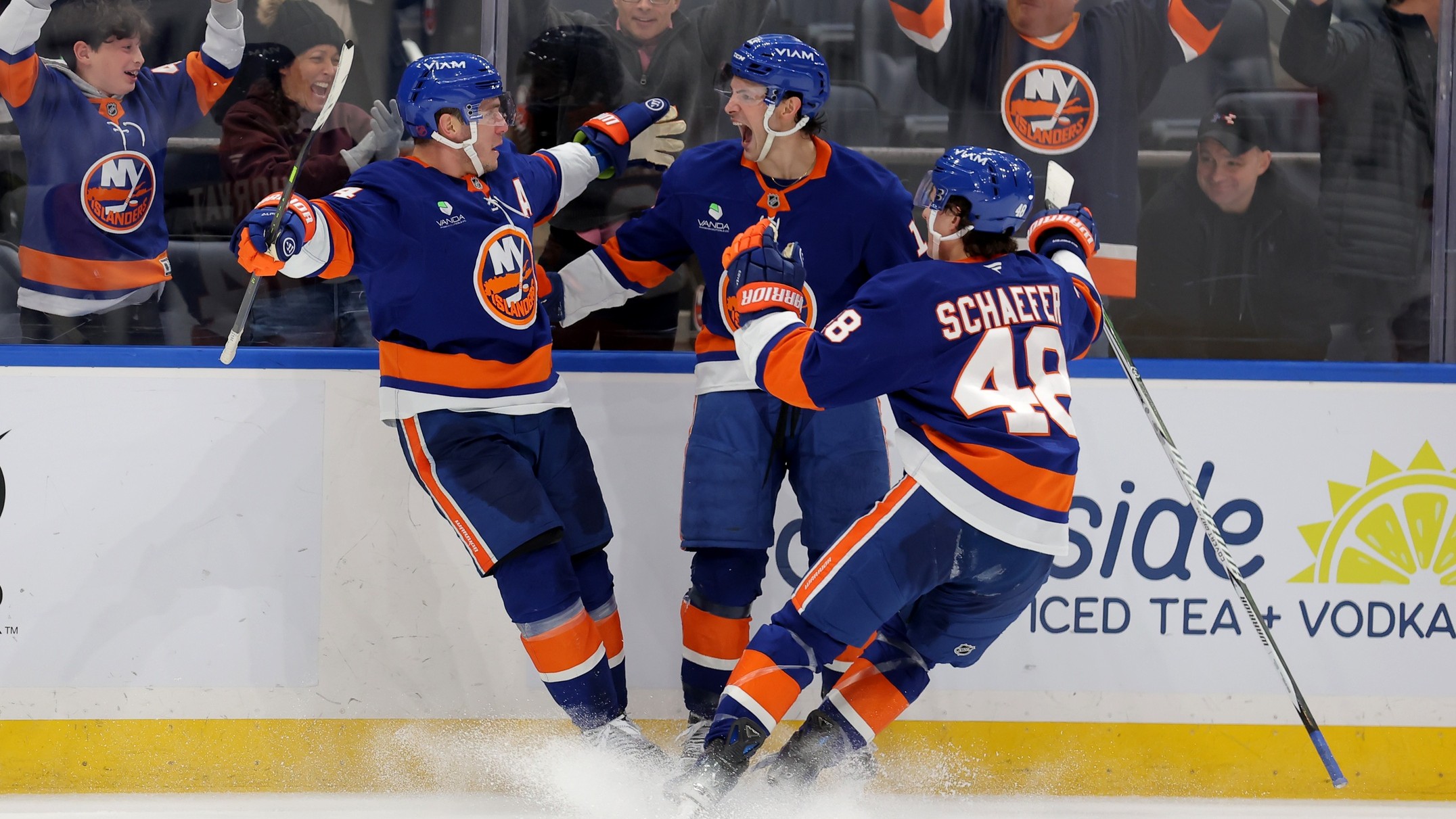 Feb 3, 2026; Elmont, New York, USA; New York Islanders center Bo Horvat (14) celebrates his game winning overtime goal against the Pittsburgh Penguins with center Mathew Barzal (13) and defenseman Matthew Schaefer (48) at UBS Arena. / Brad Penner-Imagn Images