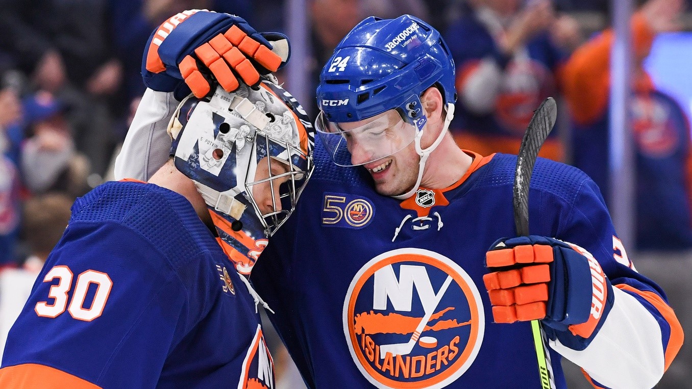 Apr 8, 2023; Elmont, New York, USA; New York Islanders defenseman Scott Mayfield (24) celebrates the 4-0 shutout against the Philadelphia Flyers with New York Islanders goaltender Ilya Sorokin (30) after the game at UBS Arena. / Dennis Schneidler-USA TODAY Sports