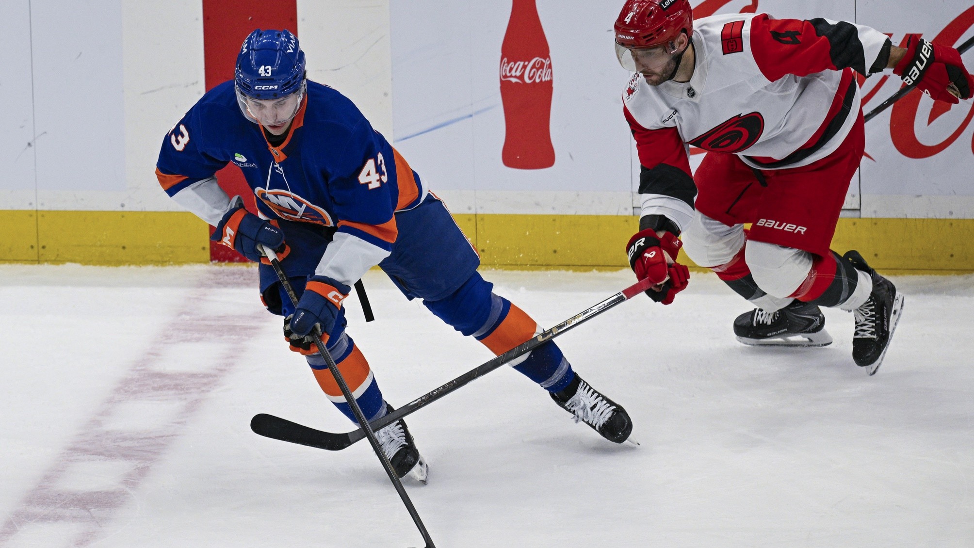 Islanders prospect Victor Eklund records first NHL point in 2-1 loss to Hurricanes to end regular seasonIsles finish season 43-34-54/15/2026, 1:41 AMAssociated PressApr 14, 2026; Elmont, New York, USA; New York Islanders center Liam Foudy (43) skates the puck into the zone defended by Carolina Hurricanes defenseman Shayne Gostisbehere (4) during the second period at UBS Arena. / Dennis Schneidler-Imagn Images