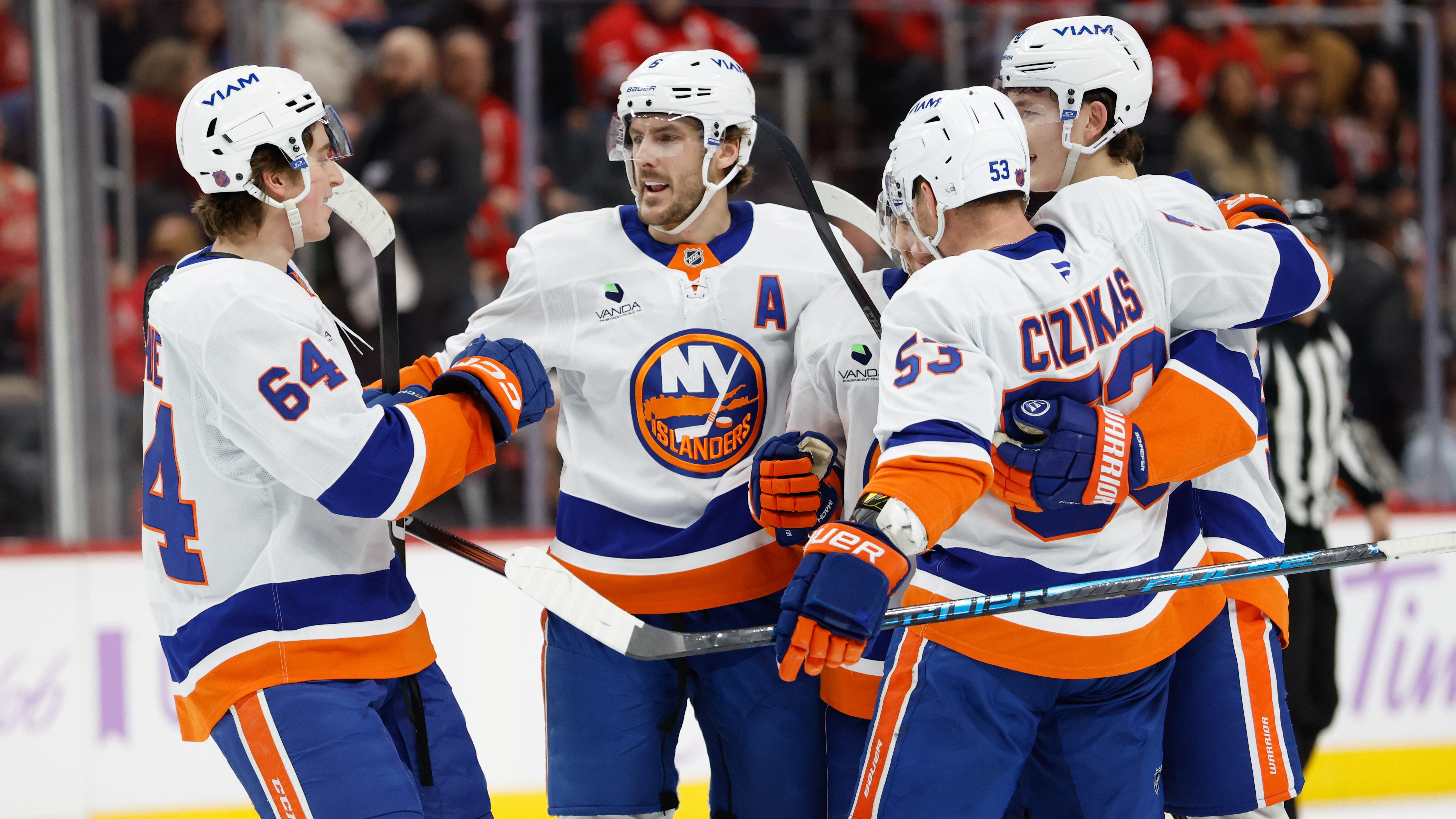 Max Shabanov scores twice as Islanders blank Red Wings, 5-0, for second straight winIlya Sorokin stopped all 29 shots in second shutout this season11/21/2025, 3:22 AMAssociated PressNov 20, 2025; Detroit, Michigan, USA; New York Islanders right wing Max Shabanov (49) receives congratulations from teammates after scoring in the first period against the Detroit Red Wings at Little Caesars Arena / Rick Osentoski-Imagn Images