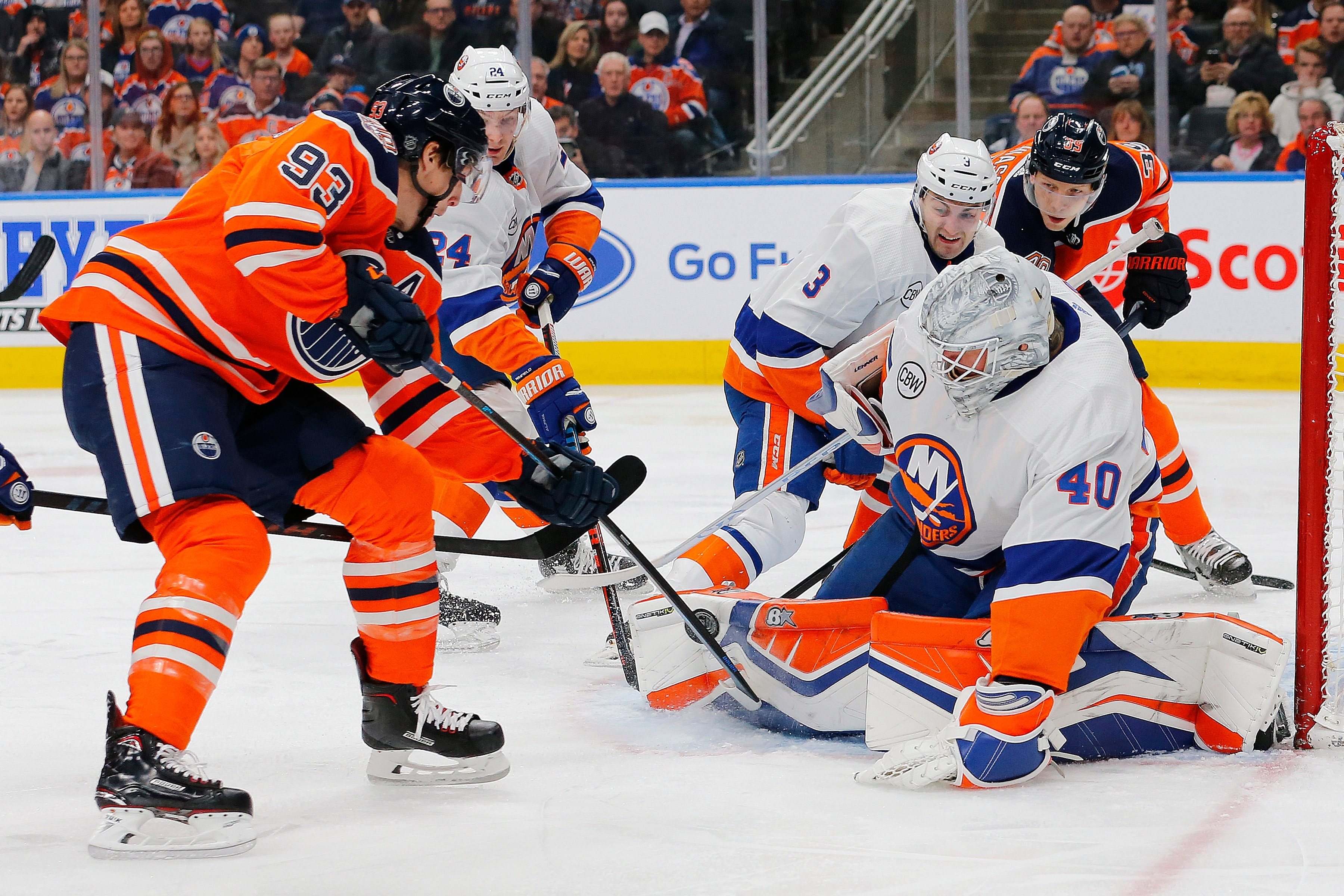 Feb 21, 2019; Edmonton, Alberta, CAN; New York Islanders goaltender Robin Lehner (40) makes a save against Edmonton Oilers forward Ryan Nugent-Hopkins (93) during the first period at Rogers Place. Mandatory Credit: Perry Nelson-USA TODAY Sports / Perry Nelson