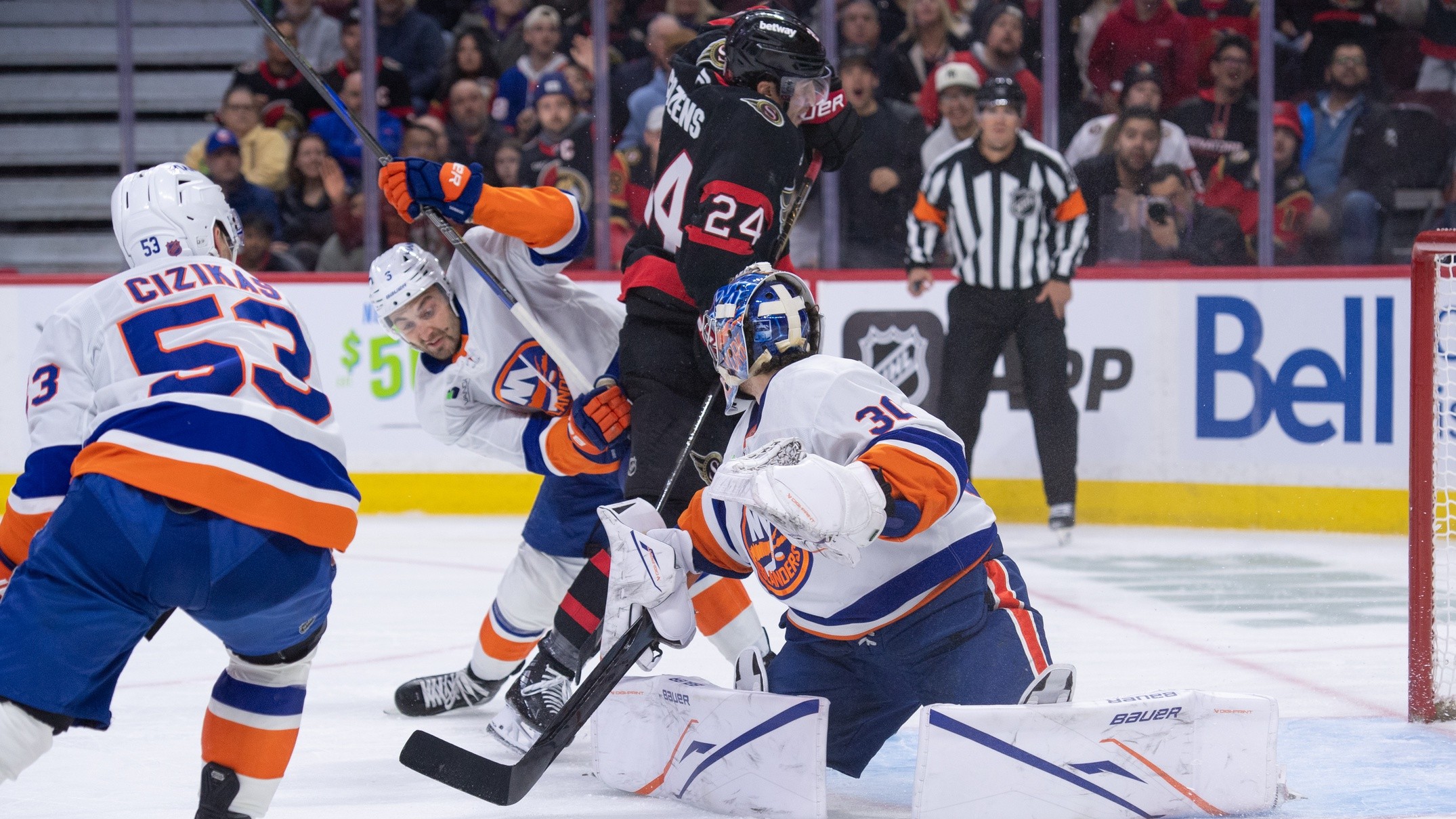 Mar 19, 2026; Ottawa, Ontario, CAN; New York Islanders defenseman Adam Pelech (3) and Ottawa Senators center Dylan Cozens (24) battle in front of Islanders Goalie Ilya Soroken (30) in the first period at the Canadian Tire Centre. / Marc DesRosiers-IMAGN Images