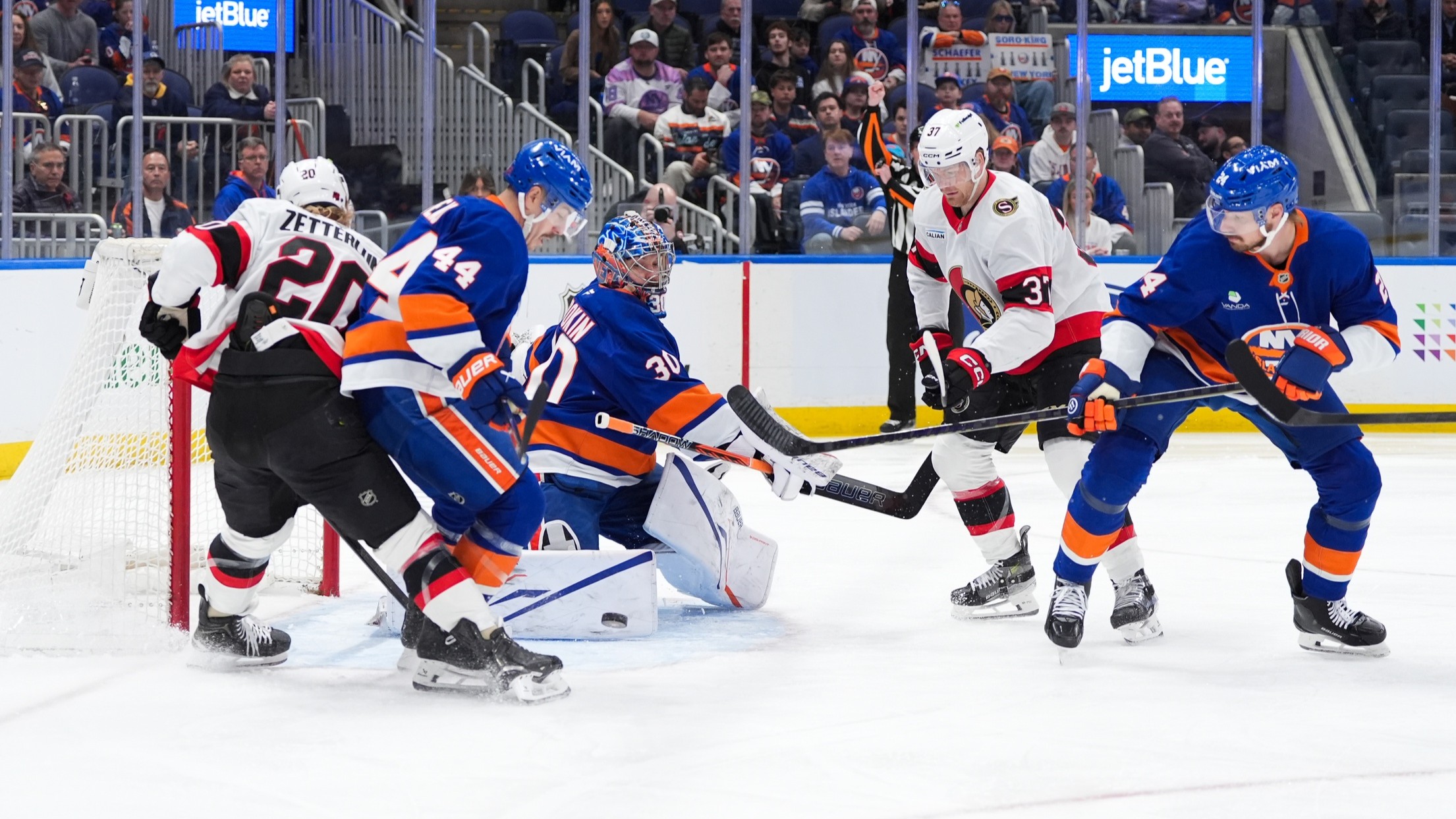 Islanders' playoff chances take major hit after 3-0 loss to SenatorsIslanders can no longer make postseason as a wild card4/11/2026, 8:13 PMAssociated PressApr 11, 2026; Elmont, New York, USA; New York Islanders goaltender Ilya Sorokin (30) makes a save on Ottawa Senators left wing Warren Foegele (37) in the first period at UBS Arena. / Alexander Wohl-Imagn Images