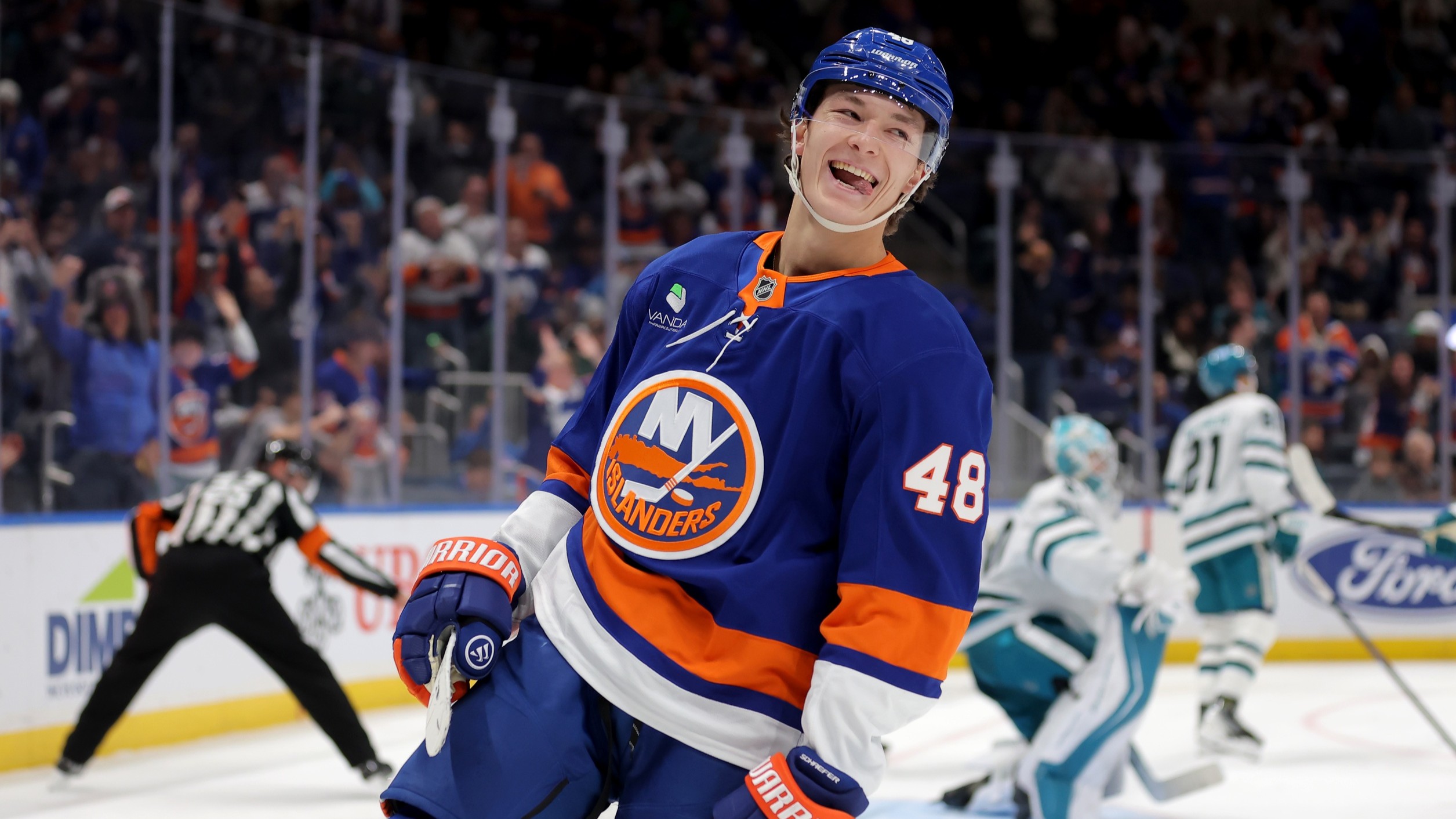 Islanders hold on for 4-3 victory over Sharks to push winning streak to three gamesIslanders now sit at 3-3-0 for the season10/22/2025, 2:03 AMAssociated PressOct 21, 2025; Elmont, New York, USA; New York Islanders defenseman Matthew Schaefer (48) celebrates his goal against the San Jose Sharks during the second period at UBS Arena. / Brad Penner-Imagn Images