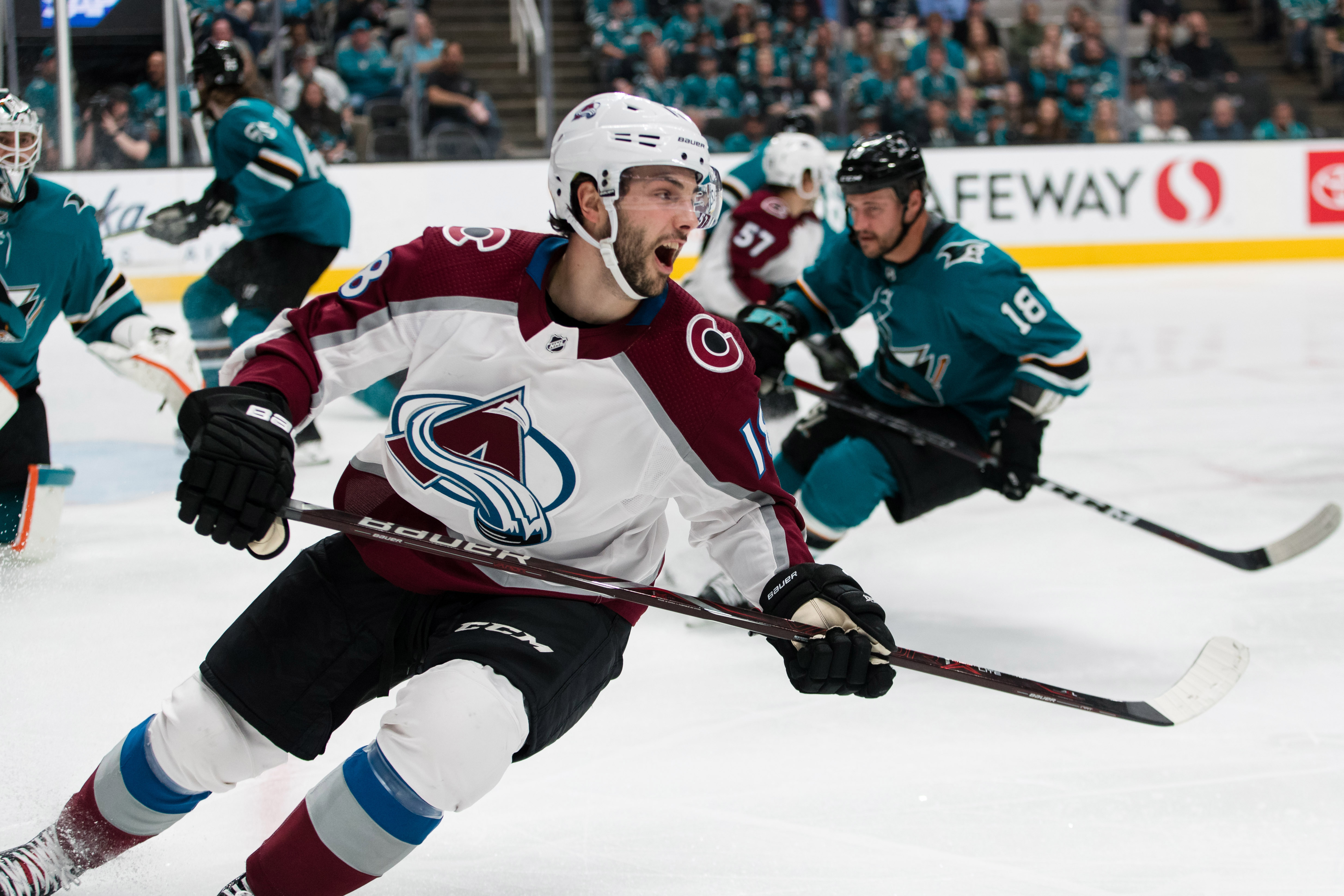 Apr 28, 2019; San Jose, CA, USA; Colorado Avalanche center Derick Brassard (18) reacts after missing a shot against the San Jose Sharks in the second period of game two of the second round of the 2019 Stanley Cup Playoffs at SAP Center at San Jose. Mandatory Credit: John Hefti-USA TODAY Sports / John Hefti