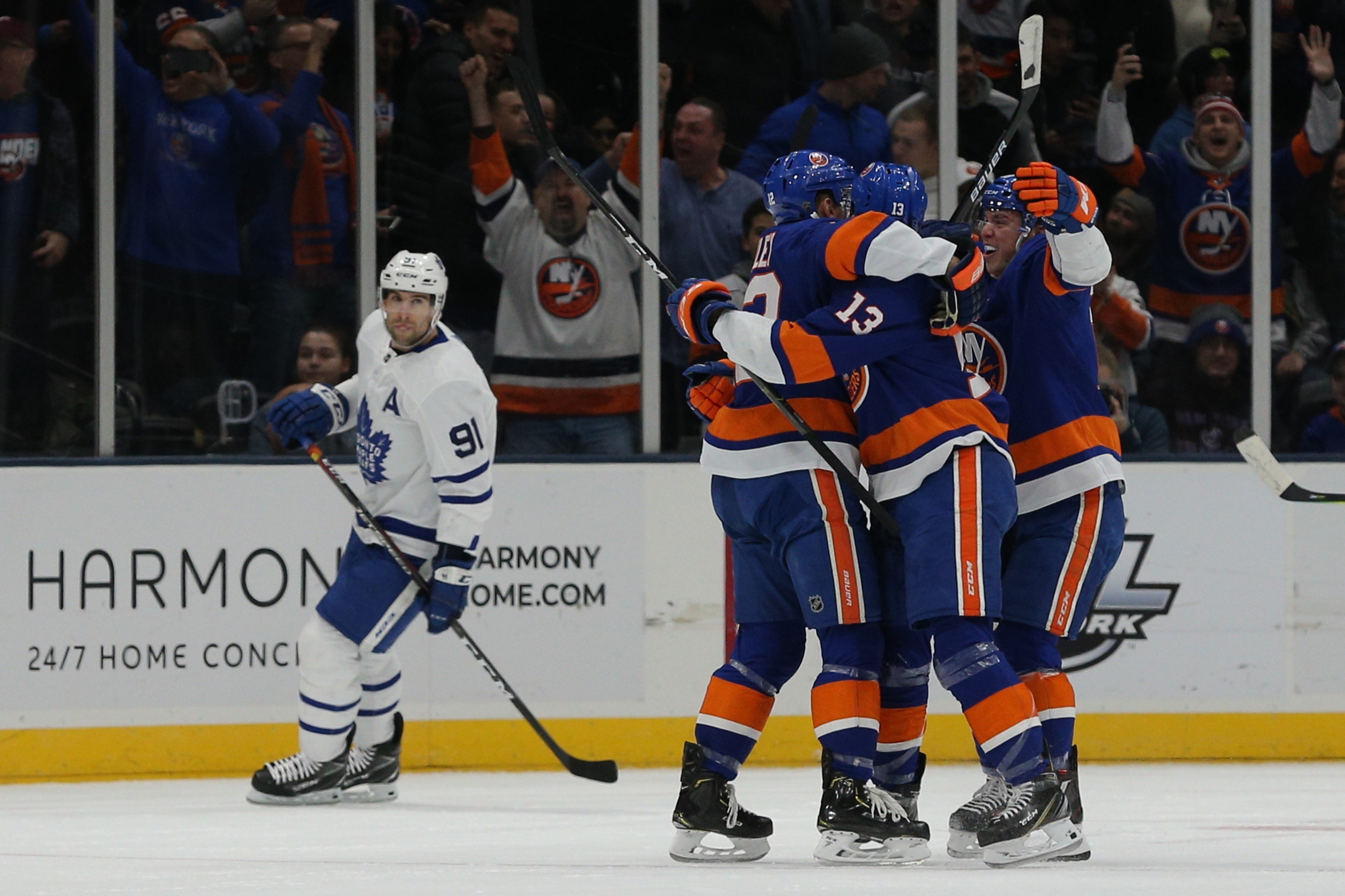 Feb 28, 2019; Brooklyn, NY, USA; New York Islanders left wing Anthony Beauvillier (18) celebrates his goal against the Toronto Maple Leafs with teammates in front of Toronto Maple Leafs center John Tavares (91) during the first period at the Nassau Veterans Memorial Coliseum. Mandatory Credit: Brad Penner-USA TODAY Sports / Brad Penner
