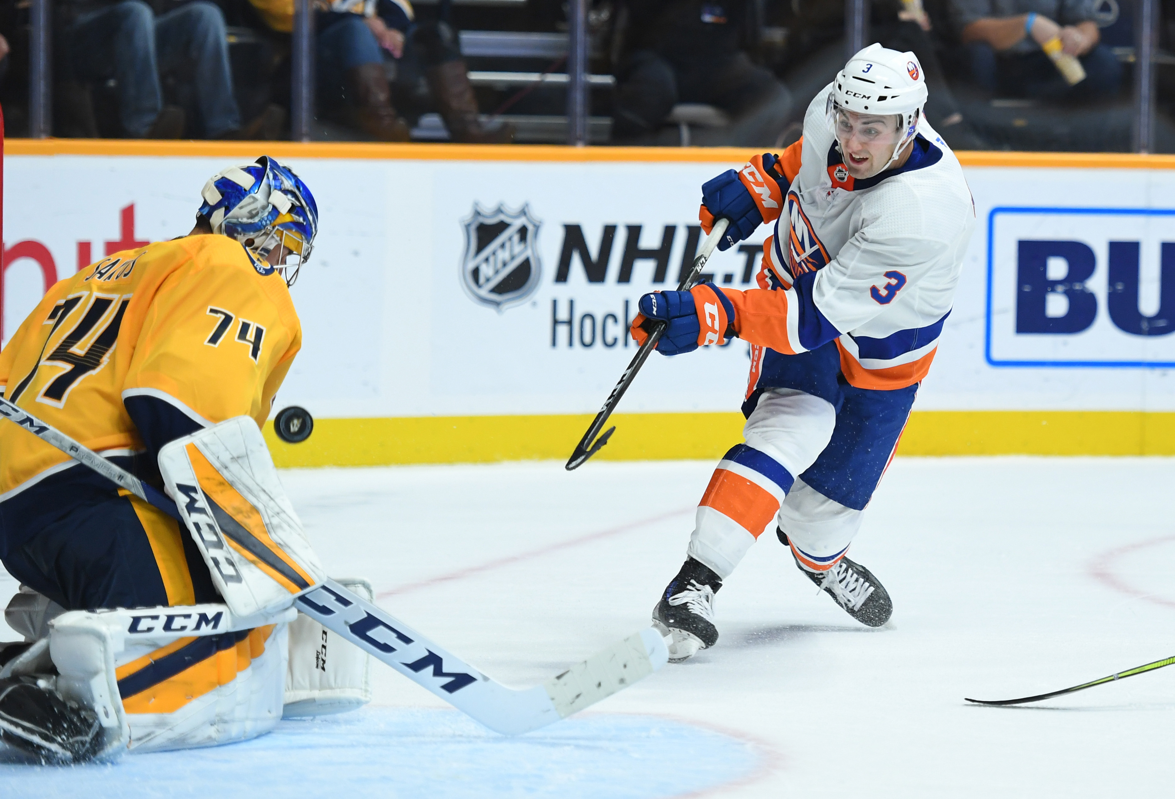 Oct 13, 2018; Nashville, TN, USA; New York Islanders defenseman Adam Pelech (3) has his shot blocked by Nashville Predators goaltender Juuse Saros (74) during the second period at Bridgestone Arena. Mandatory Credit: Christopher Hanewinckel-USA TODAY Sports / Christopher Hanewinckel