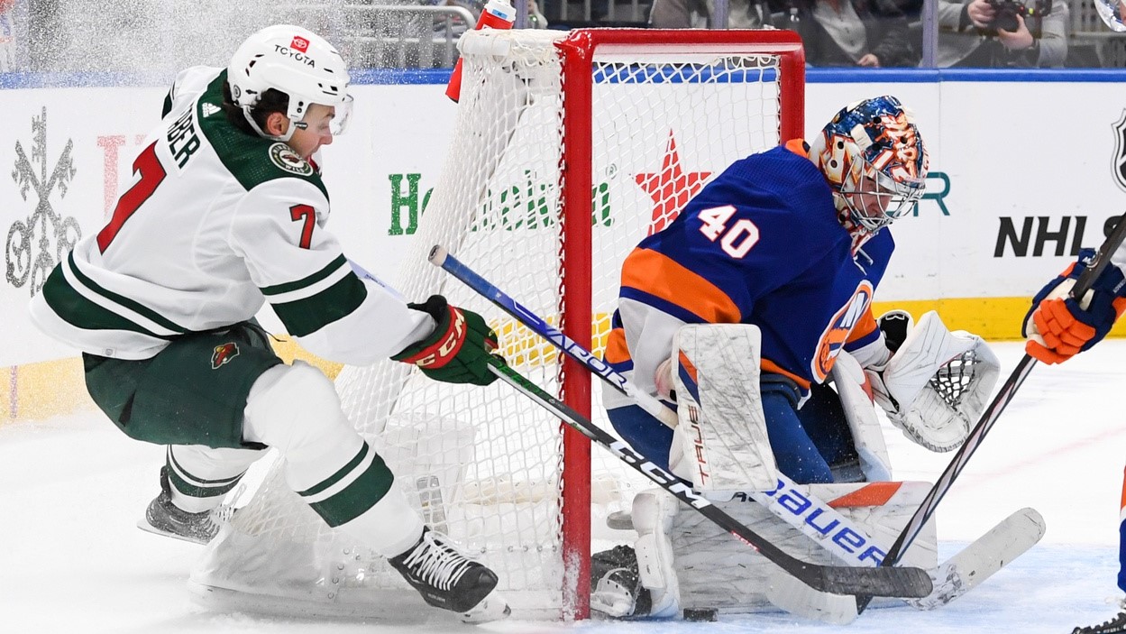 Back-to-back goals in third period doom Islanders in 4-2 loss to WildMinnesota scores twice within 42 seconds en route to victory11/8/2023, 3:44 AMAssociated PressNov 7, 2023; Elmont, New York, USA; New York Islanders goaltender Semyon Varlamov (40) makes a save against Minnesota Wild defenseman Brock Faber (7) during the first period at UBS Arena. / Dennis Schneidler-USA TODAY Sports