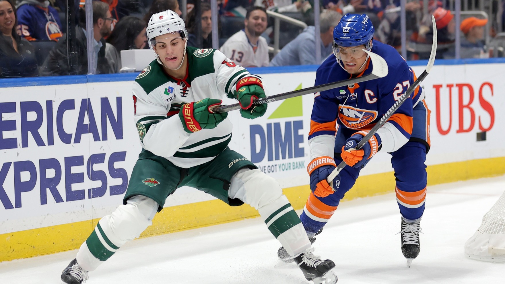 Islanders look disjointed in sloppy 5-2 loss to WildLoss snaps three-game points streak11/8/2025, 2:53 AMAssociated PressNov 7, 2025; Elmont, New York, USA; Minnesota Wild defenseman Zeev Buium (8) fights for the puck against New York Islanders left wing Anders Lee (27) during the first period at UBS Arena. / Brad Penner-Imagn Images