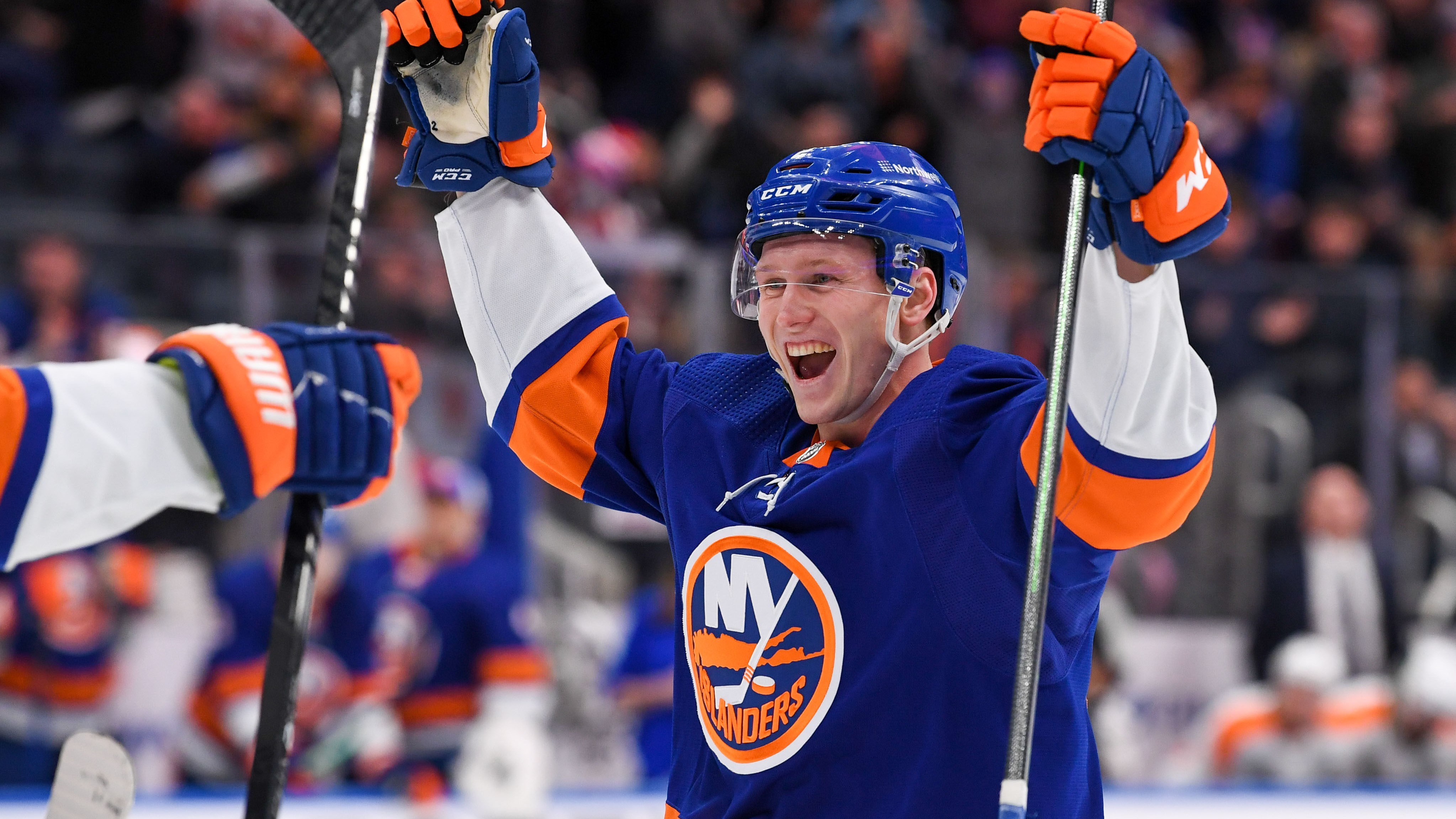 Jan 17, 2022; Elmont, New York, USA; New York Islanders defenseman Robin Salo (2) celebrates after assisting on a goal by New York Islanders center Casey Cizikas (53) (not pictured) against the Philadelphia Flyers during the second period at UBS Arena. Mandatory Credit: Dennis Schneidler-USA TODAY Sports / Dennis Schneidler-USA TODAY Sports