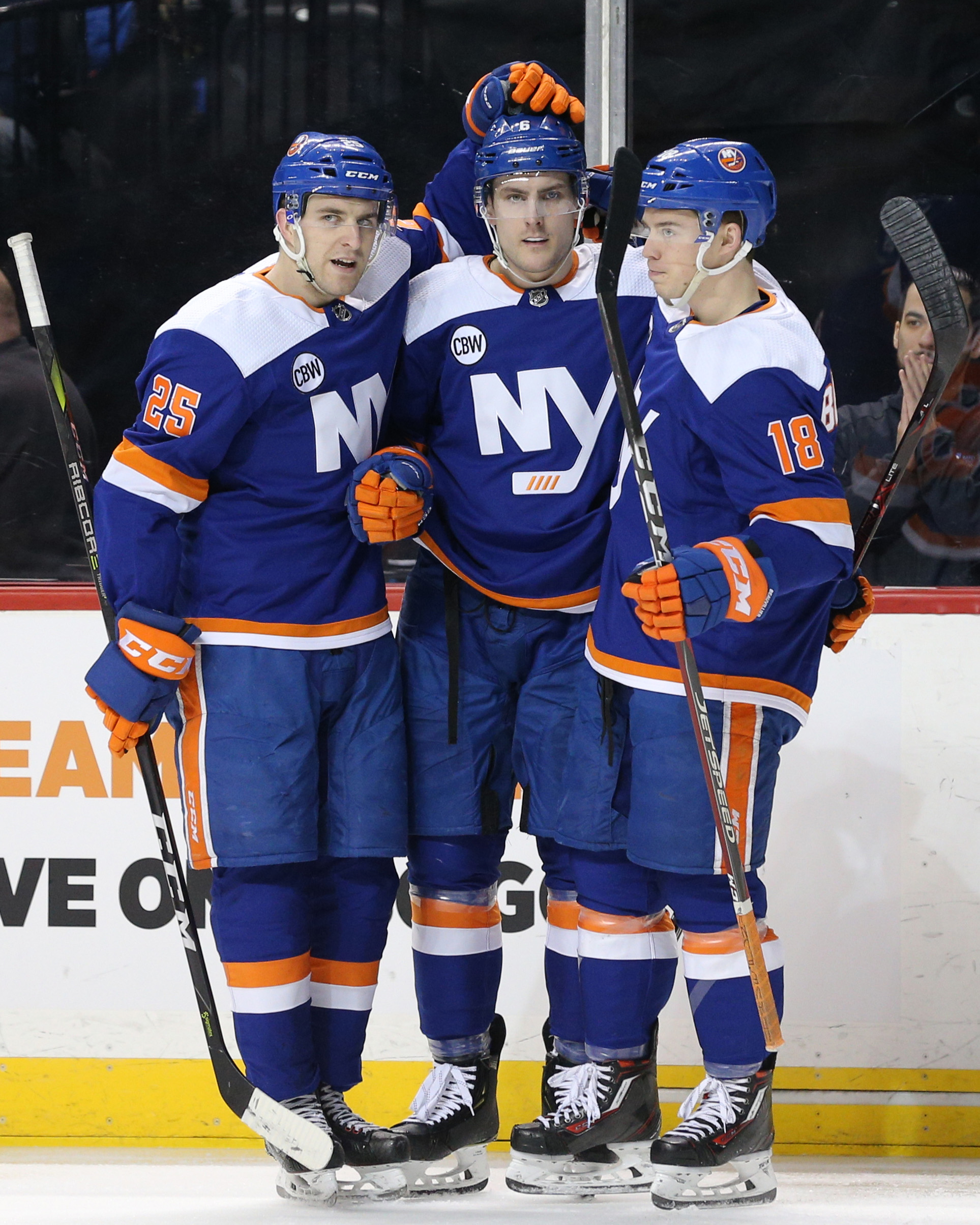 Feb 16, 2019; Brooklyn, NY, USA; New York Islanders defenseman Ryan Pulock (6) celebrates his goal against the Edmonton Oilers with defenseman Devon Toews (25) and left wing Anthony Beauvillier (18) during the second period at Barclays Center. Mandatory Credit: Brad Penner-USA TODAY Sports / Brad Penner