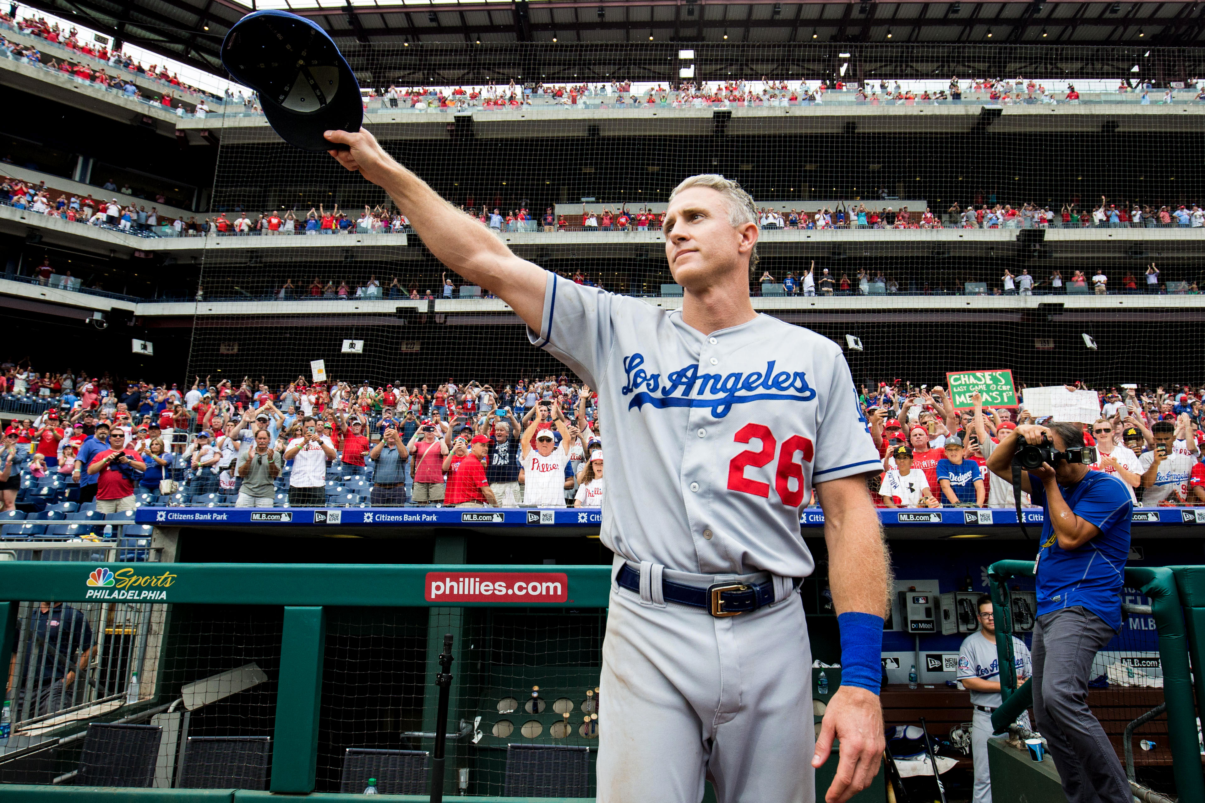Jul 25, 2018; Philadelphia, PA, USA; Los Angeles Dodgers second baseman Chase Utley (26) tips his cap to fans after a game against the Philadelphia Phillies and his last regular season appearance at Citizens Bank Park. Mandatory Credit: Bill Streicher-USA TODAY Sports / Bill Streicher